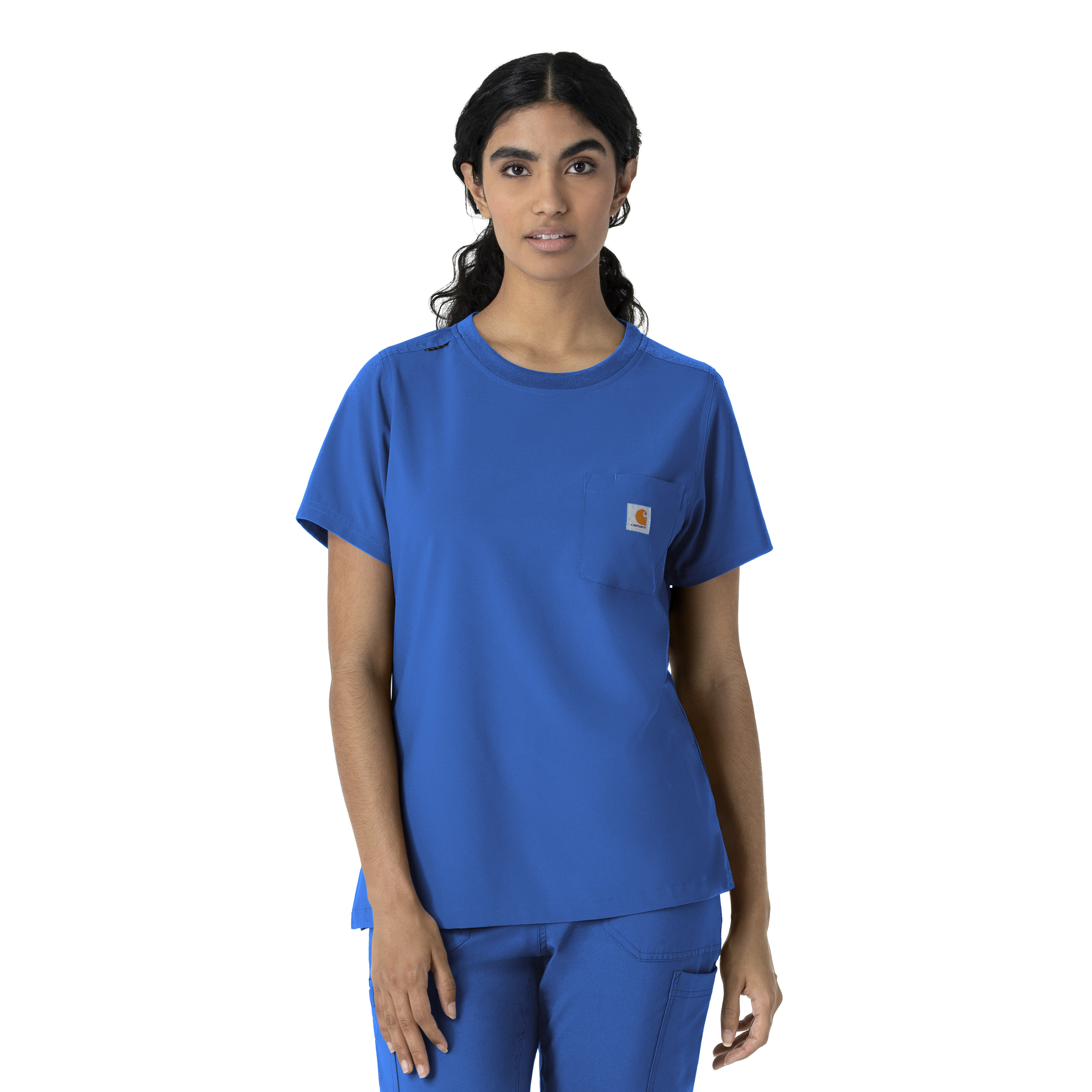 This women's Carhartt scrub top is the perfect blend of everyday comfort and rugged durability, designed to tackle the challenges of long, demanding shifts. It's crafted from a durable stretch polyester fabric that moves with you, providing the flexibility needed for dynamic work environments. The material is built to withstand the wear and tear of a busy workday, ensuring longevity and consistent performance. While it maintains the casual appearance of a classic t-shirt, this scrub top is packed with functional features. A secure zip pocket adds an extra layer of security for valuables. The integrated shoulder badge loop ensures your ID is always visible and readily accessible, streamlining identification procedures. This top is designed to keep you comfortable and organized throughout your shift. 94% Polyester/6% Spandex Womens Pullover Modern Crew Neck Knit fabric crew neck with shoulder badge loop One top loading chest pocket with pen slot Side hem vents for ease of movement at hips Forward shoulder seams Durable and comfortable polyester spandex blend of fabric Machine wash cold with like colors on gentle. Tumble dry on low. Promptly remove from dryer. Cool iron if needed. Avoid using bleach or harsh chemicals.