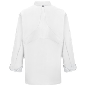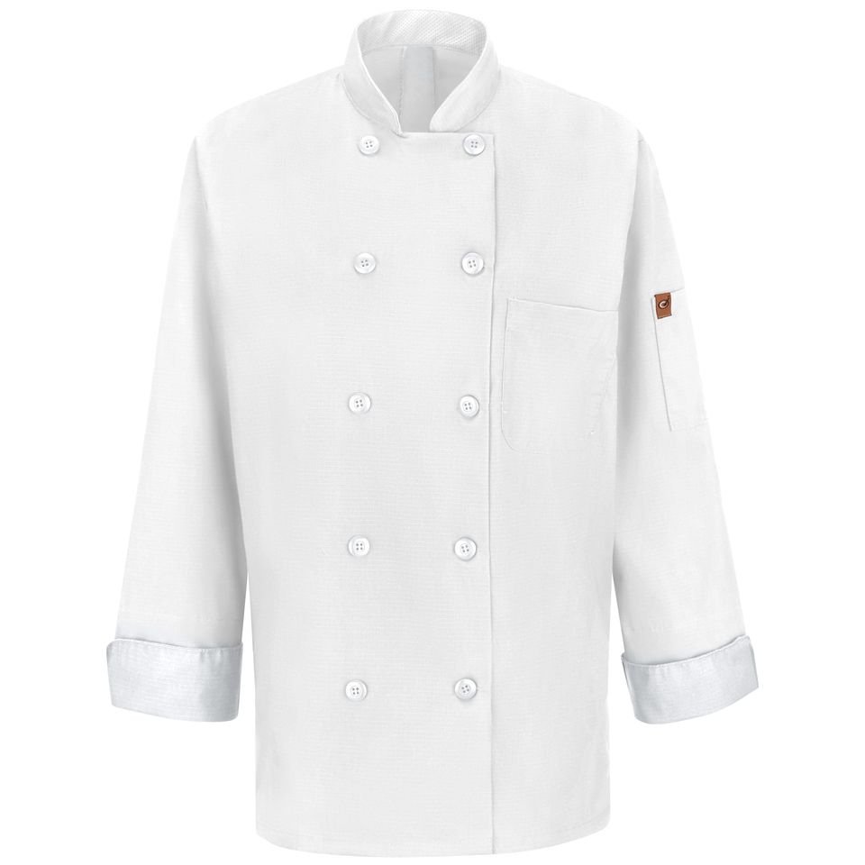 Forget about stains and motion restriction with our Women's Ten Button Chef Coat with MIMIX™ and OilBlok. It comes with strategically placed MIMIX™ stretch panels for enhanced mobility and maximum range of motion while performance mesh improves breathability. This chef coat is packed with features like OilBlok technology to repel liquids such as cooking oil and keep stains from forming so you look professional the entire day. It also has superior color rentention and wickability. This is the only women's chef coat like this on the market! 4.25 oz. RipstopBody: 4.25 oz. Ripstop 65% Polyester/ 35% CottonBody: 65% Polyester / 35% Cotton|Flex Panels: 100% Polyester Ten button closure Mesh lined stand-up collar looks professional while keeping you cool and comfortable 2 Left chest pocket, Thermometer pocket on left sleeve Industrial Laundry - OilBlok|Home Wash
