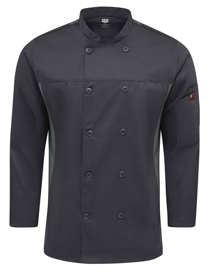 A kitchen staple. Our classic fit Deluxe Airflow Chef Coat for men fits all shapes and sizes. The lightweight fabric wicks moisture and releases tough kitchen stains so you’ll look clean and professional until shift’s end. Strategically placed, perforated stretch panels improve airflow for enhanced cooling while providing an elevated look. A double-breasted closure with matching buttons and two inset chest pockets offer sophisticated styling, while turn-back long sleeves offer versatility. Topped off with a handy dual utensil sleeve pockets for go-to kitchen gadgets and a lined collar for added comfort. Available in three colors. Body: 4.6 oz. Twill|Stretch Panels: 3.5 oz. Stretch Woven Body: 65% Polyester / 35% Cotton|Stretch Panels: 100% Polyester Collar lined with perforated fabric for comfort Dual utensil/thermometer pockets on left sleeve|Two inset utensil pockets for extra storage Industrial Laundry - Heavy Soil|Industrial Laundry - Light Soil|Home Wash