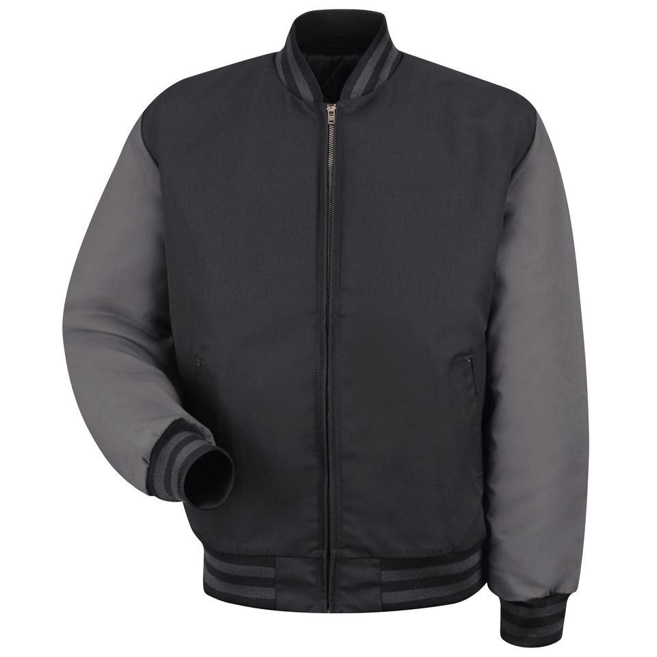 Cold weather never stops a hard worker. Team up with this black polyester lined work jacket when working outside or in a drafty garage. Rimmed with a traditional styled, double-striped rib-knit on the cuffs, collar, and waistband, this Duo-Toned Team Jacket with a shiny brass zipper is insulated and is meant to keep you comfortable while you take care of a tough job. 7.25 oz. Twill Shell: 65% Polyester / 35% Cotton|Lining: 100% Polyester|Insulation: 100% Polyester *Insulation content may vary Solid brass zipper 1% polyester double-striped knit Welted slash pockets 100% polyester double-striped knit Industrial Laundry - Heavy Soil|Industrial Laundry - Light Soil|Home Wash