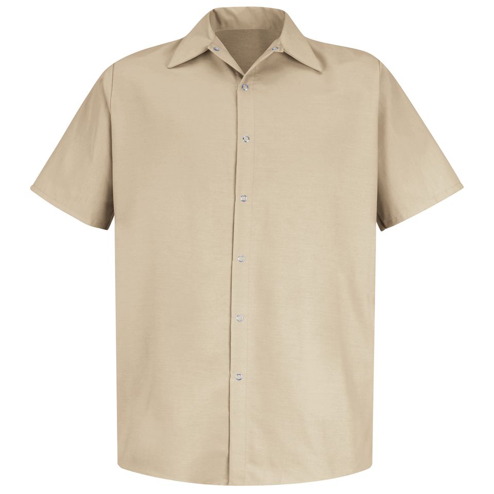 This short-sleeve, snap-up work shirt might look simple, but it’s a snap shirt packed with performance features for jobs related to food processing. To start, its regular fit means your work shirt will offer true-to-size fitting. Plus it’s enhanced by stain-release, lightweight fabric. This soil-release fabric also wicks away sweat, keeping you drier and more comfortable in any work conditions. 4.25 oz. Poplin 65% Polyester / 35% Cotton Seven gripper front Two-piece, lined, sewn-in stays Industrial Laundry - Heavy Soil|Industrial Laundry - Light Soil|Home Wash