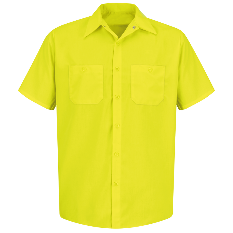 Looking for a way to catch the everyone’s eye? Our Enhanced Visibility Work Shirt comes in a fluorescent shade to make sure you’re seen in busy settings. For those who like to come prepared, the shirt has two button-thru, hex-style chest pockets with a pencil stall to keep small tools nearby and a UPF 40 rating to keep you safe on sunny work days. 5 oz. PoplinBody: 5 oz. Poplin 100% PolyesterBody: 100% Polyester Six button down front and gripper closure at neck Two-piece lined collar with sewn-in stays Two button-thru chest pockets, left with pencil stall Industrial Laundry - Heavy Soil|Industrial Laundry - Light Soil|Home Wash