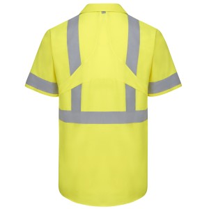 With liquid-repelling fabric that is 75% stronger and 15% lighter than other workwear fabrics, our Short Sleeve Hi-Visibility Ripstop Work Shirt with MIMIX™ and OilBlok sets a new standard for what a work shirt should be. Strategically placed mesh stretch panels provide unmatched maneuverability and breathability while 2-inch reflective silver striping meets Type R Class 2 requirements and ensures 360o visibility. Body: 4.25 oz. Ripstop|MIMIX™ Panels: 4.2 oz. Performance MeshBody: 4.25 oz.|Flex Panels: 4.2 oz. Body: 65% Polyester / 35% Cotton|MIMIX™ Panels: 100% PolyesterBody: 65% Polyester / 35% Cotton|Flex Panels: 100% Polyester ANSI 107 ANSI 107 Type R Class 2 Concealed, snap-front placket Two button-thru, hex-style chest pockets with pencil stall in left chest pocket Industrial Laundry - OilBlok|Home Wash