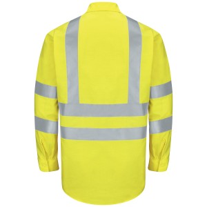 With additional reflective striping on the sleeves and body, our Hi-Visibility Work Shirt kicks it up to high gear. Two button-thru chest pockets and a pencil stall protect your on-the-job tools, while 360° visibility and UPF 40 protect on-the-job you. And the poly/cotton fabric with Ripstop technology makes this shirt durable, lightweight, and breathable. ANSI/ISEA 107 Class 3 Compliant. 4.25 oz. RipstopBody: 4.25 oz. 65% Polyester / 35% CottonBody: 65% Polyester / 35% Cotton ANSI 107 ANSI 107 Type R Class 3 Six button down front and gripper closure at neck Industrial Laundry - Heavy Soil|Industrial Laundry - Light Soil|Home Wash