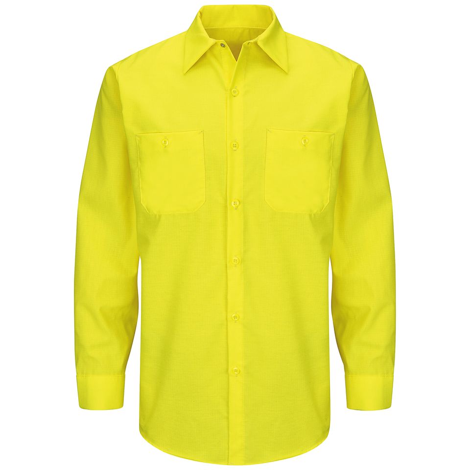 Just like your work, our fluorescent yellow Enhanced Visibility Work Shirt will make sure you stand out in the crowd. Not only will you you stay visible on the job site, the Ripstop fabric is both 35% more breathable than 100% polyester fabrics and is 75% stronger than other poplin fabrics. That means you’ll be able to take on the toughest of jobs without worrying about the losing out on work quality or style. 4.25 oz. RipstopBody: 4.25 oz. Ripstop 65% Polyester / 35% CottonBody: 65% Polyester / 35% Cotton Six Buttons, Gripper closure at neck Two-piece lined collar with sewn-in stays Two button-thru chest pockets, left with pencil stall Industrial Laundry - Heavy Soil|Industrial Laundry - Light Soil|Home Wash