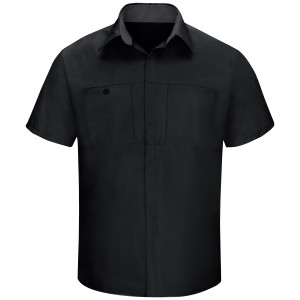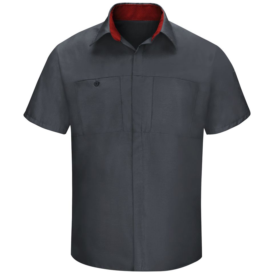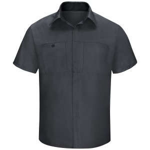 The fabric of this short sleeve work shirt is finished with OilBlok technology, designed to repel some of the toughest garage fluids. The flex stretch panels on this shop shirt offer improved mobility and breathability while underarm mesh gussets deliver an increased range of motion and breathability. Topped with specialty chest pockets and a utility pocket, this shop shirt is always up to the task. Body: 4.25 oz. Ripstop|Flex Panels: 4.2 oz. Performance Mesh Body: 65% Polyester / 35% Cotton|Flex Panels: 100% Polyester Concealed, no-scratch Six gripper front with no neck closure Mesh-lined, banded collar with sewn-in stays Button-thru right chest pocket, Left chest pocket with pencil stall, Utility sleeve pocket on left sleeve Home Wash|Industrial Laundry - OilBlok|Industrial Laundry - Light Soil