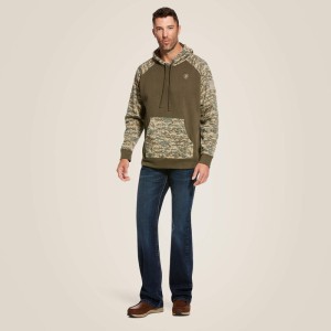 • AriatTEK® is designed for optimal comfort in any weather • Greater Arm Mobility™ lets you move freely • Camo print adjustable hood • sleeves and kangaroo pocket • Solid body with Ariat® logo • Embroidered American flag patch • Ribbed cuffs and hem