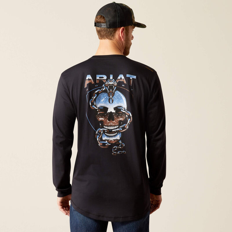 Performance and durability you can count on, in a comfy graphic T-shirt. This stain-resistant, sweat-wicking work-week essential refreshes classic Ariat graphics with a bold, chrome finish.