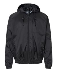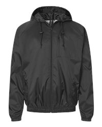 3.5 oz. 100% nylon taffeta shell coach-style hooded button-up jacket 100% polyester lining Weather resistant Side pockets Elastic cuffs Raglan sleeve Waist toggle pull SCUBA neck hood Chest pocket Dyed to match zipper Sizes: S-3XL