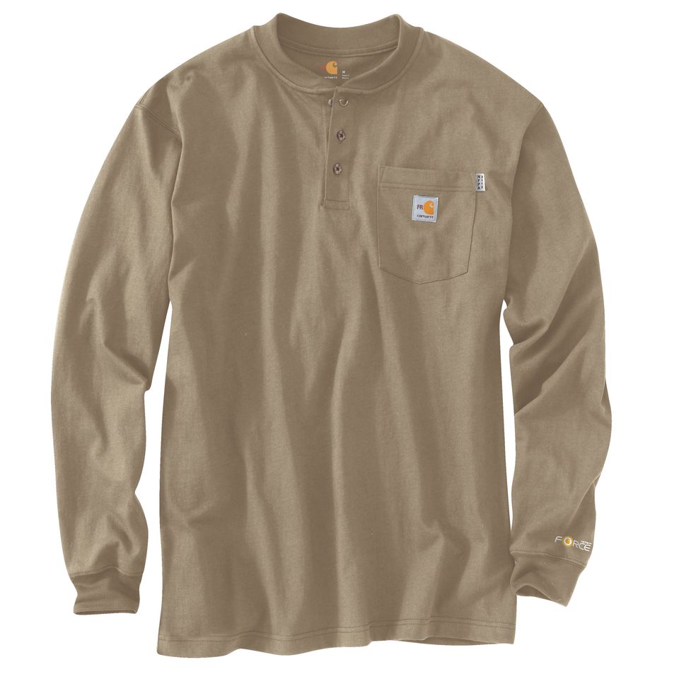 Description When you need to stay covered on the job, this men's flame-resistant henley has your back. The shirt is made for comfort from lightweight FR jersey that wicks away sweat and fights odor. It Features its rating labels right on the chest pocket, making it quick and easy for safety checks. Features 6.75-ounce, 100% cotton FR jersey Meets the performance requirements of NFPA 70E UL® classified to NFPA 2112 Carhartt FR and NFPA 2112/CAT 2 labels sewn on pocket Built with Force technology to wick sweat and dry fast FastDry® technology wicks away sweat and fights odors Model Height: 6'2" Chest Size: 40.5" Wearing Size M Side-seam construction minimizes twisting Rib-knit henley collar with three-button placket Left chest pocket Model No. TK0237-FRM Country of Origin: Imported