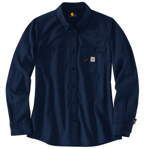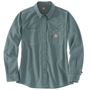 Description When you work near open flame or electrical hazards, safety and comfort are intertwined. The women's FR shirt keeps you dry and comfortable, so you can stay focused on the task at hand. Features 4.7 ounce, FR twill: 50% Lenzing™ FR/38% modacrylic/10% polyamide/2% anti-stat Button down collar with buton closure FR melamine buttons throughout Two chest pockets button closure Extended sleeve plackets with two-button adjustable cuffs Triple stitched main seams Carhartt FR label sewn on left pocket NFPA 2112/CAT 2 labels sewn on sleeve placket Meets the performance requirements of NFPA 70E/ASTM F1506 and is UL® classified to NFPA 2112 Model No. TW4138-FRW Country of Origin: Imported