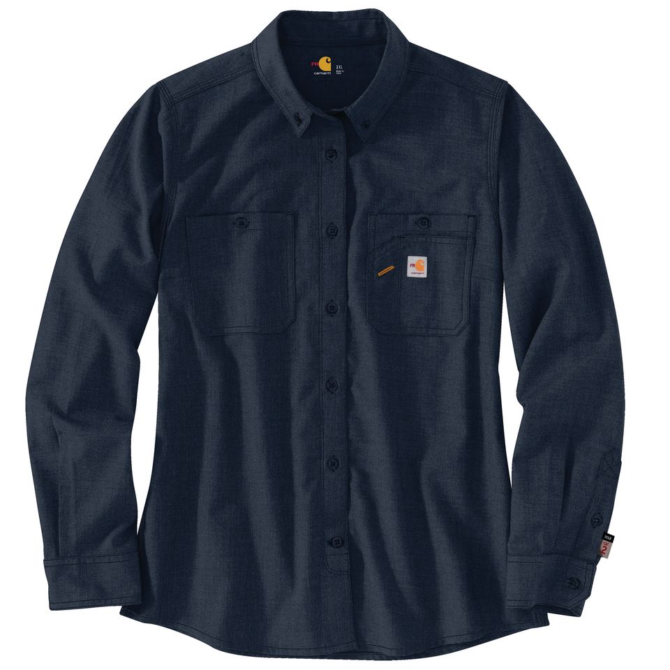 Description When you work near open flame or electrical hazards, safety and comfort are intertwined. The women's FR shirt keeps you dry and comfortable, so you can stay focused on the task at hand. Features 4.7 ounce, FR twill: 50% Lenzing™ FR/38% modacrylic/10% polyamide/2% anti-stat Button down collar with buton closure FR melamine buttons throughout Two chest pockets button closure Extended sleeve plackets with two-button adjustable cuffs Triple stitched main seams Carhartt FR label sewn on left pocket NFPA 2112/CAT 2 labels sewn on sleeve placket Meets the performance requirements of NFPA 70E/ASTM F1506 and is UL® classified to NFPA 2112 Model No. TW4138-FRW Country of Origin: Imported