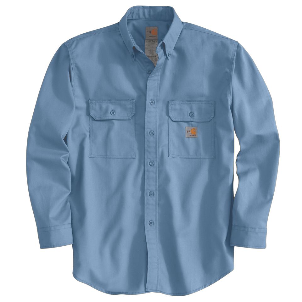 Description Designed to handle the most rugged working conditions, this men's button-down shirt keeps you safe from dangerous arcs and flame. It's made of FR twill, with durable triple-stitched seams. The utilitarian design Features two flap pockets on the chest. Features 7-ounce, 88% cotton / 12% high-tenacity nylon FR twill Meets the performance requirements of NFPA 70E UL® classified to NFPA 2112 Carhartt FR label sewn on left pocket; NFPA 2112/CAT 2 label sewn on sleeve placket Carhartt-strong triple-stitched main seams Button-down collar and front; Flame-resistant melamine buttons Extended sleeve plackets with adjustable two-button cuffs Two chest pockets with flaps and button closures Model No. TW0160-FRM Country of Origin: Imported