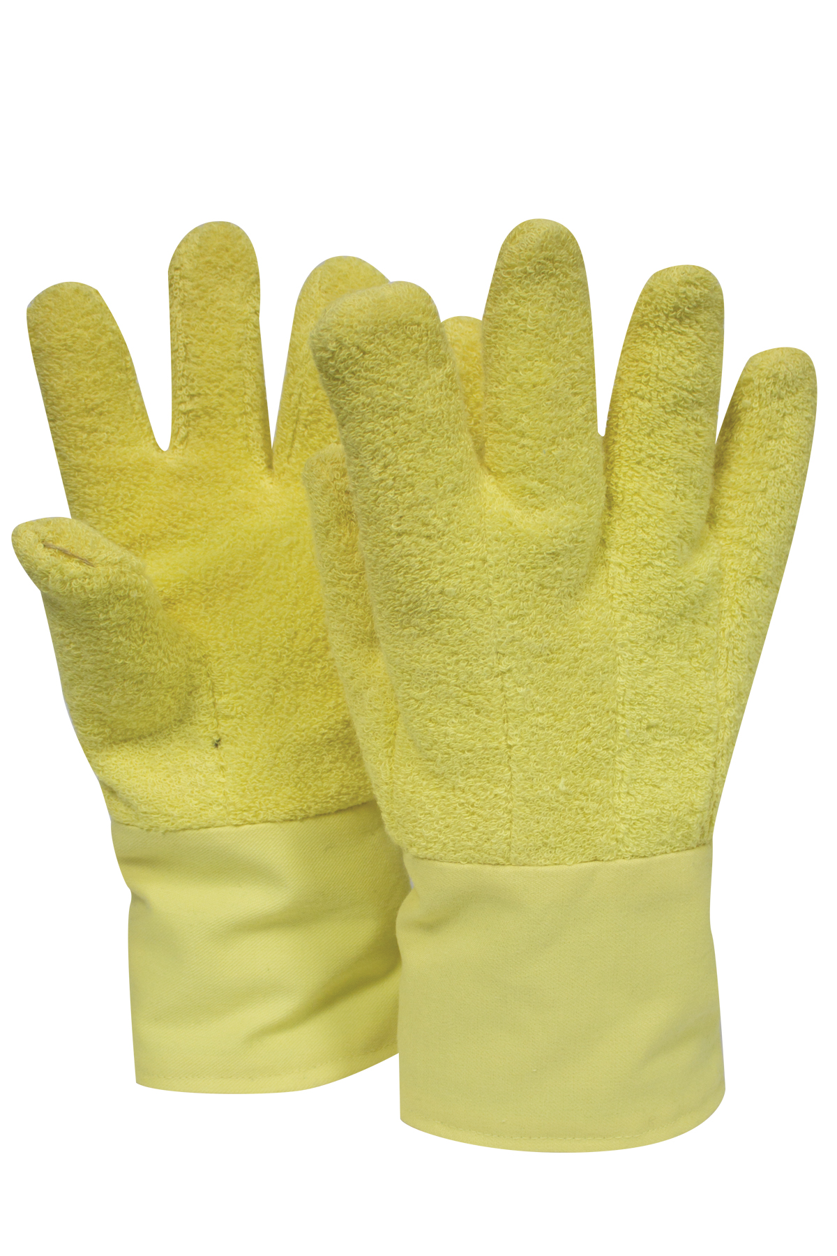 NSA Terry Extreme Heat Glove with Twill Cuff High Heat Hand Protection Tested to ASTM F1060 @ 1000F. Average time to second degree burn 26.66 seconds Provides high heat protection Twill cuff provides cut, puncture, and abrasion protection Wool lining Straight thumb Palm patch provides extra insulation/protection 22 oz. Kevlar® Terrycloth & 8 oz. Kevlar® Twill Cuff USA Heat Level 6