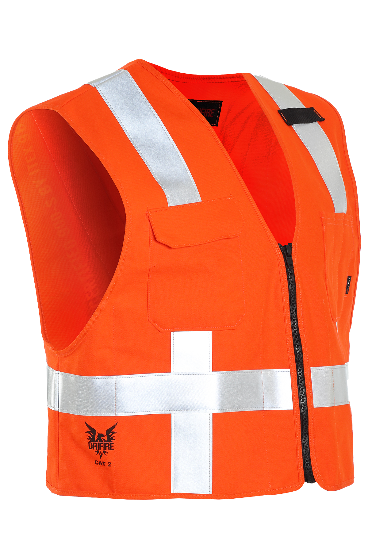 DRIFIRE Orange FR Deluxe Vest Non-HV Men's FR Work Wear Short waist design for easy accommodation of a tool belt Four pockets: cell phone, pencil and two lower pockets FR zip front closure Silver FR solid reflective material Mic-clip band on left shoulder Reflective trim for enhanced visibility - does not meet ANSI 107 9 oz. Orange 100% FR Cotton Dominican Republic CAT 2 11.2 cal/cm² NFPA 70E CSA Z462 ASTM F1506 OSHA 1910.269