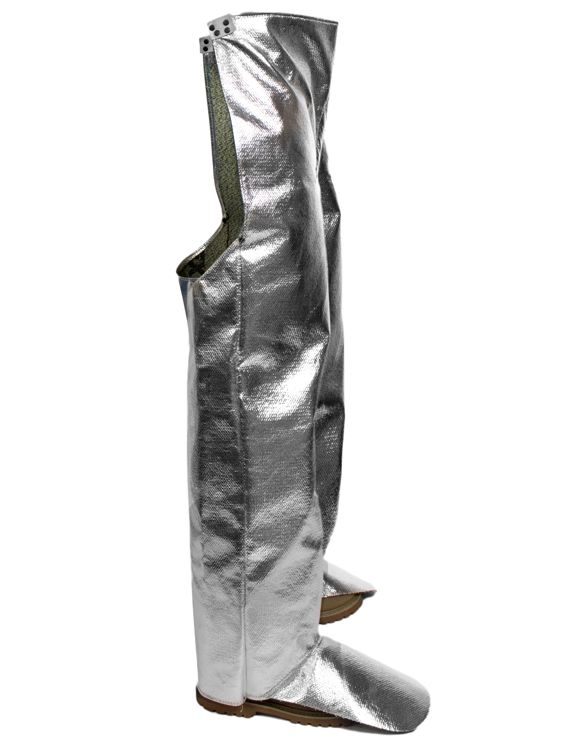 NSA CARBON ARMOUR Aluminized Chaps Primary Aluminized Protection Leather strap at waist with belt buckle for adjustment Leather crotch reinforcement Aluminized foot flap Provides protection from radiant heat, sparks, and molten metal splash hazards 19 oz. Aluminized OPF/Para-Aramid USA ASTM F955 ASTM F1939