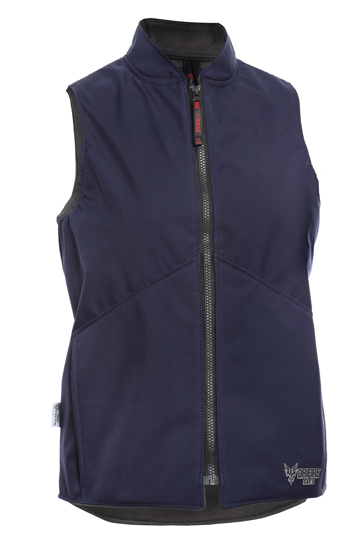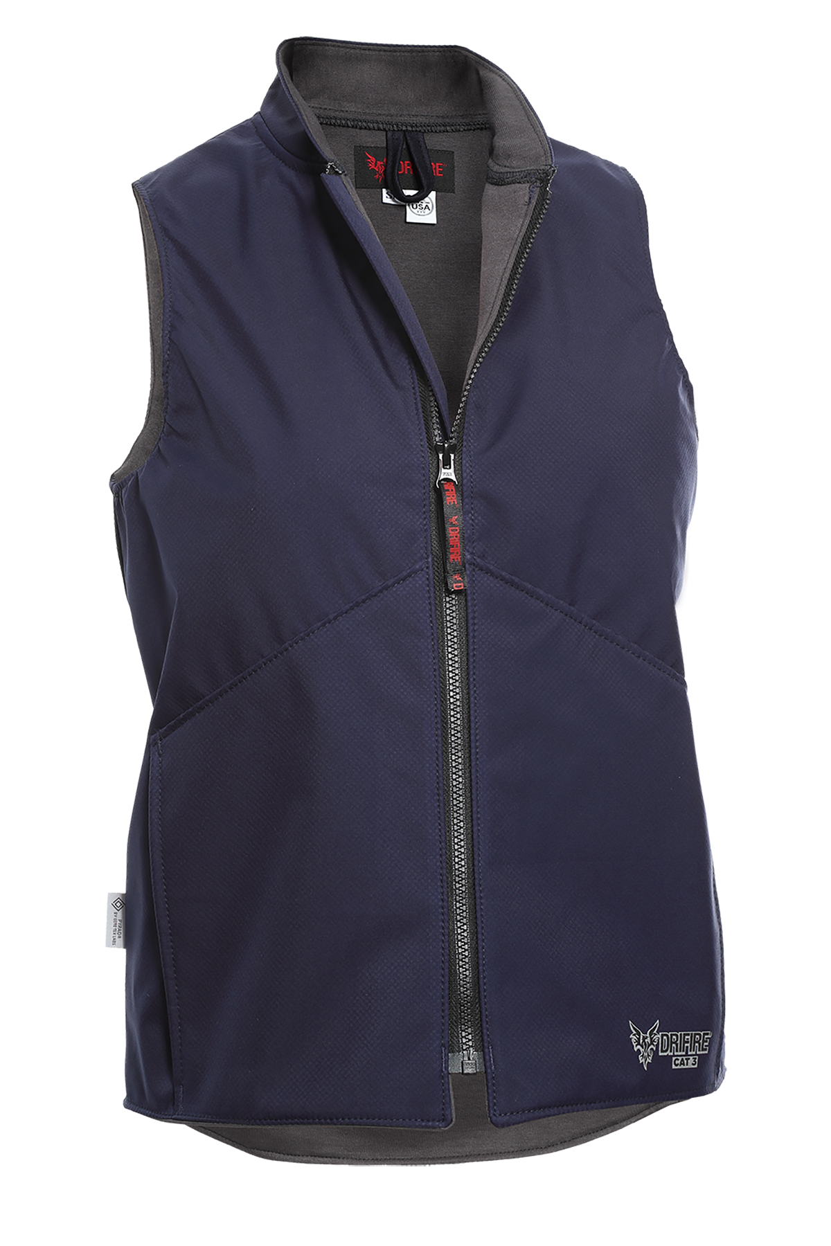 DRIFIRE Women's FR Fleece Lined Vest Women's FR Work Wear Lightweight, breathable, and fast drying Wind and water resistant Inside chest pocket Lined pockets to keep your hands warm Resists cold cracking in low temperatures Extended Tail offers extra coverage Hanger loop in back neckline 7 oz. PYRAD® Fabric by GORE-TEX LABS, lined with 14 oz. modacrylic blend fleece USA CAT 3 30 cal/cm² NFPA 70E CSA Z462 ASTM F1506 OSHA 1910.269