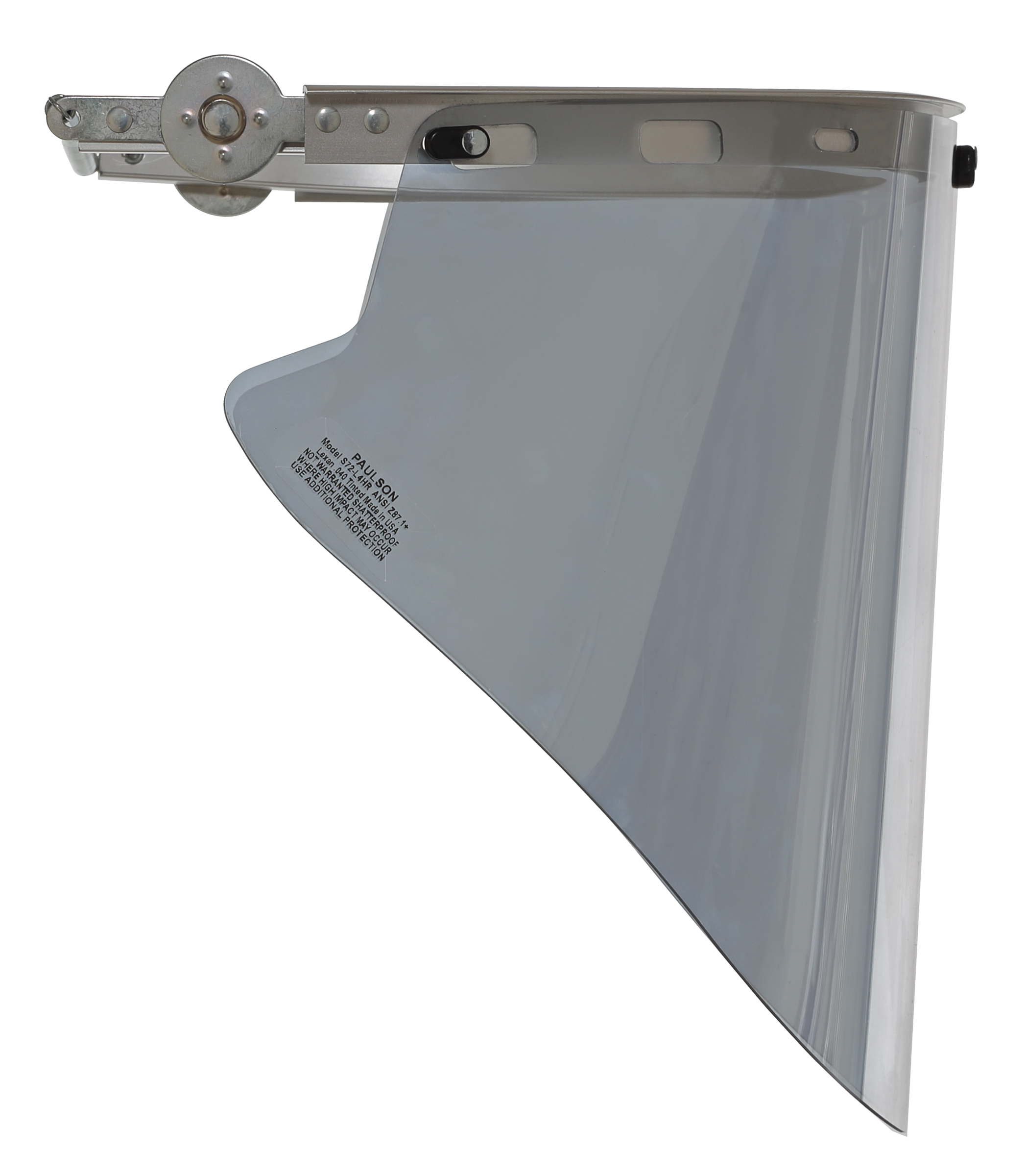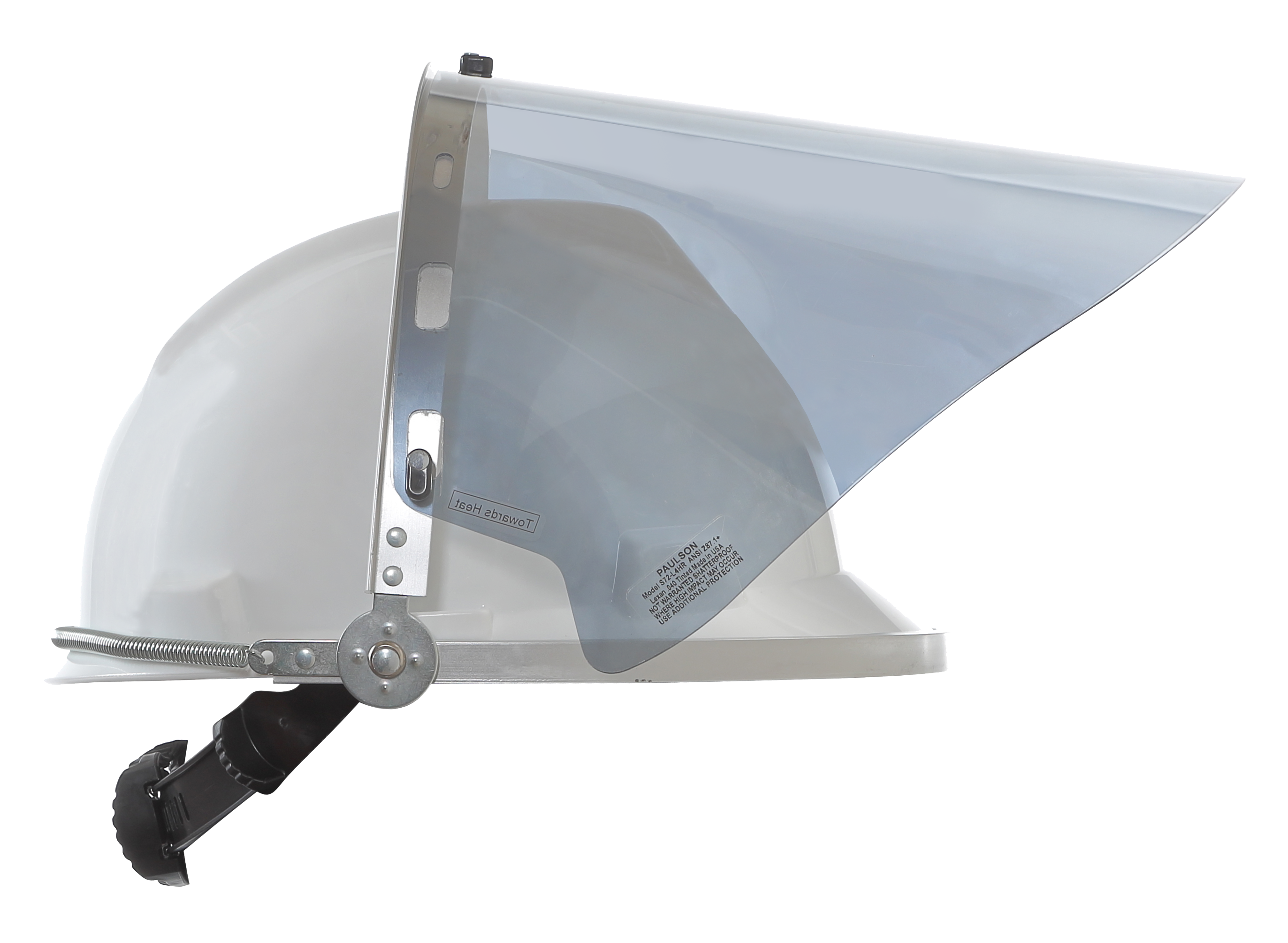 NSA Clear Aluminized High Heat Faceshield with Metal Bracket High Heat Head Protection Recommended for high temperature industrial applications High Heat Protection – Aluminized film reflects radiant heat and UltraViolet radiation Impact Protection – Polycarbonate faceshield performs excellent against high-speed impact Metal Bracket – Built to withstand prolonged exposure to high heat environments Compatibility – Bracket is compatible with most manufacturers’ cap style hard hats Hard hat not included Polycarbonate with Aluminized Film USA Impact Rating Z87+ Visible Light L2 UltraViolet Radiation U2.5