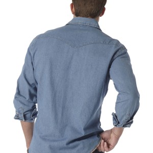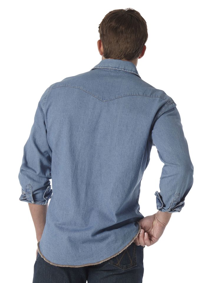 THE ORIGINAL WORK SHIRT FOR COWBOYSOne wardrobe staple a cowboy should never be without is a work shirt that can hold its own. That's precisely why our Cowboy Cut® work shirt is designed with hard work in mind, so you can get any job done with total confidence. Every Cowboy Cut® work Western denim snap shirt comes with all the authentic details you'd expect from a tried-and-true Wrangler® essential, including Western front and back yokes, a spread collar, two spade flap snap pockets, the Wrangler® logo riser label on the left pocket, and our decorative 'W' stitching. Just like the jeans in our Cowboy Cut® collection, the Cowboy Cut® Western snap denim work shirt will keep you dressed and ready for anything.