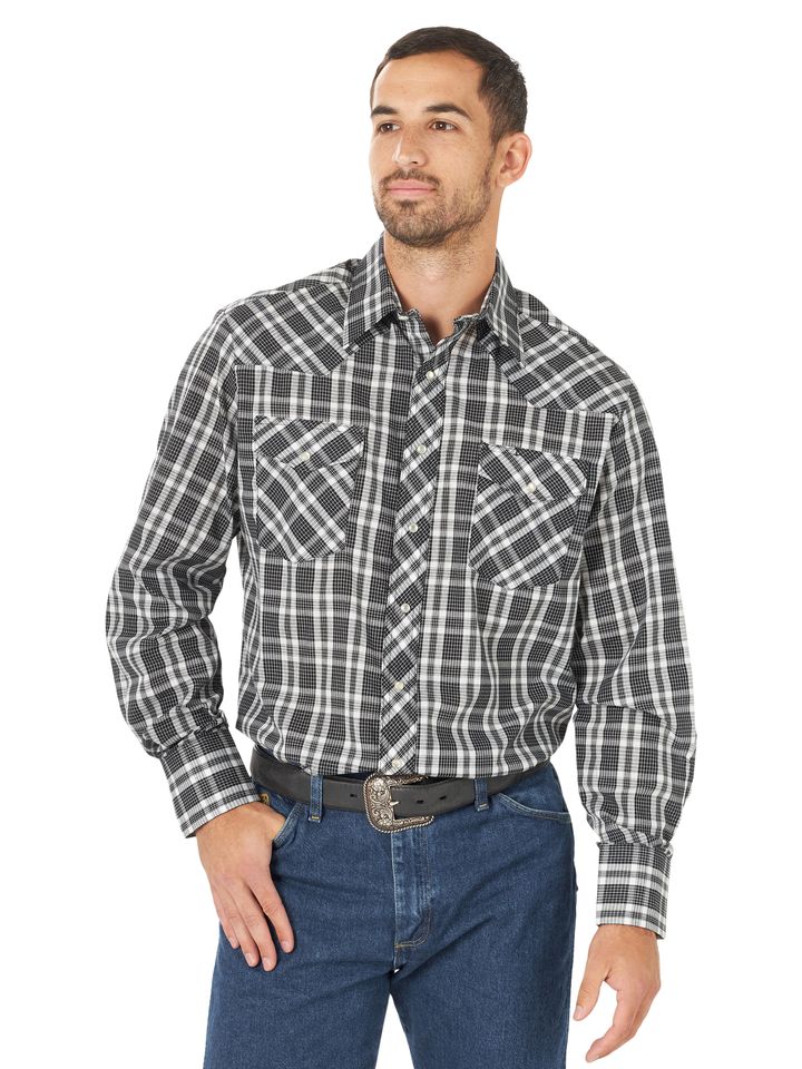 Sport Western Snap Plaids. Big and Tall Sizes. Long Sleeves. Spread Collar. Authentic Western Front and Back Yokes. Two Snap Flap Pockets. Authentic Three Snap Western Cuffs. Wash and Wear Easy Care Fabric. Neck and Sleeve Sizes. Selection Varies Each Season.55% Cotton / 45% Polyester