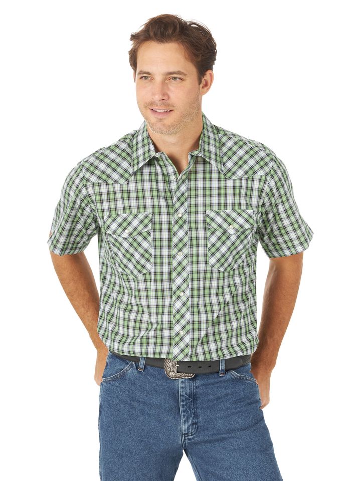 Sport Western Snap Plaids. Short Sleeves. Spread Collar. Authentic Western Front and Back Yokes. Two Snap Flap Pockets. Wash and Wear Easy Care Fabric. Neck Sizes. Selection Varies Each Season. 55% Cotton / 45% Polyester