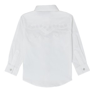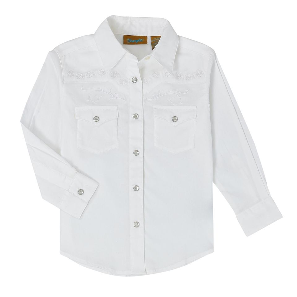 BASIC WITH PRETTY DETAILS.The crisp white shirt has fancy Western yokes with rhinestones and embroidery.Long sleevesSnaps100% cotton