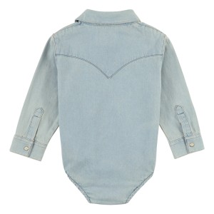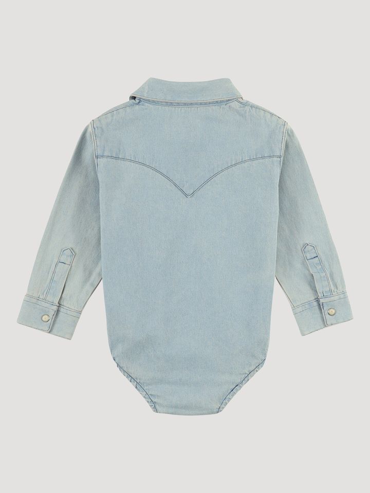 DENIM FOR YOUR COWBOY.Everybody loves the easygoing style of denim, including babies. This long sleeve bodysuit has Western yokes, snap flap pockets, and a snap seat closure for swift diaper changeups.