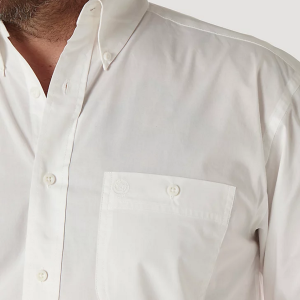 George Strait has teamed up with Wrangler® National Patriot™ program to support our troops. The King of Country's signature style solid button-down long sleeve will now help raise funds for military charities. Tailored details include: a button down collar, straight back yoke, two button adjustable cuff, and button-thru pocket with embroidered logo.