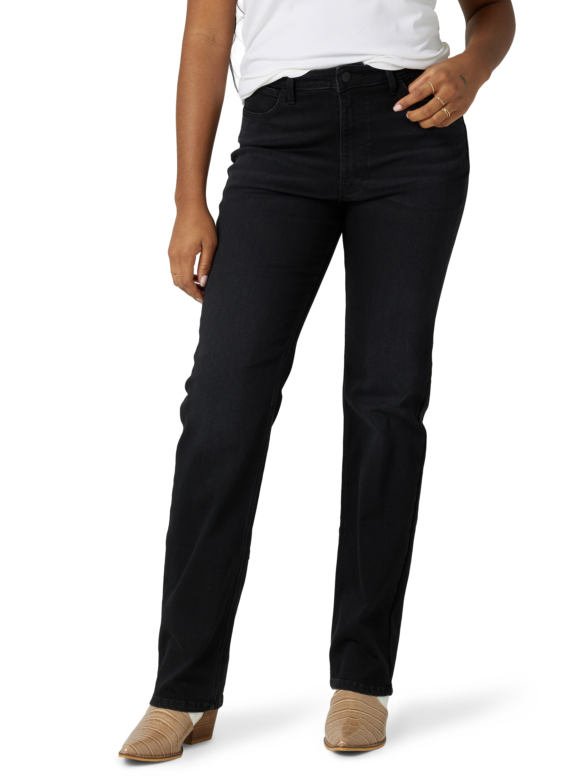 A staple in the Wrangler® assortment and a staple in women's closets around the world. These Wrangler women's straight leg jeans are crafted with a figure-flattering high rise that contours your curves with a comfortable, no-gap waistband. The classic straight leg silhouette extends from the thigh through the hem for an opening that fits snugly around boots, heels, sandals, and sneakers. Versatile, year-round style reaches its peak with these timeless straight leg jeans.
