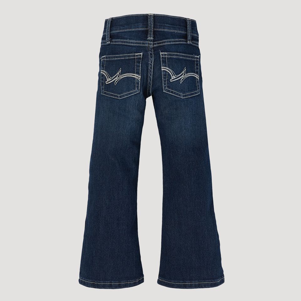 START HER OFF IN PREMIUM STYLE.Comfortable, modern style for your little girl, these bootcut jeans are made for a western lifestyle. With a comfortable regular fit in the seat and hips and a leg that kicks out starting around the knee into a bootcut opening, your cowgirl will be ready to pair these with her favorite boots.