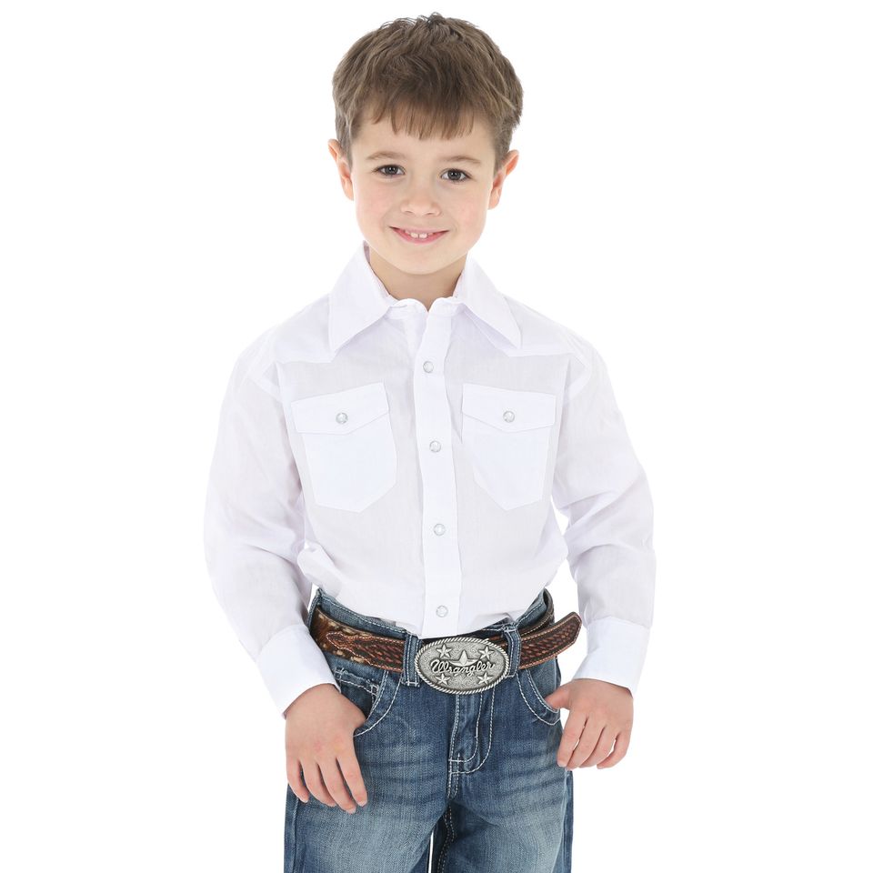 WHITE AND CRISP, AT LEAST UNTIL HE WEARS IT OUT THE DOOR!For 'cleaned up occasions' this shirt fits the bill. Crisp broadcloth (just like Dad wears), Western front and back yokes, snap cuffs, all sized just right for a young boy's proportions.