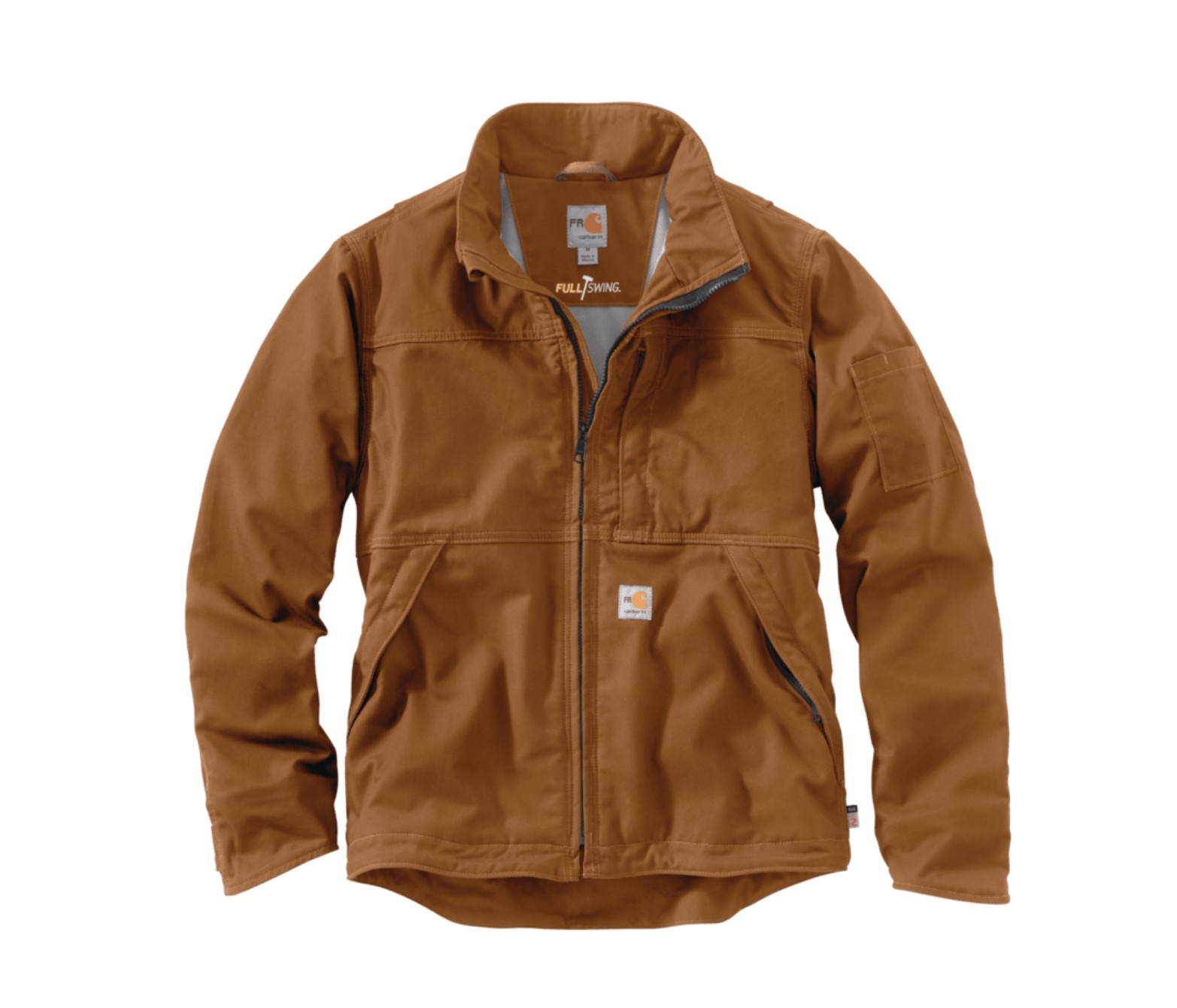 FABRIC 8.5-ounce, 88% cotton/12% nylon FR Quick Duck™ canvas FEATURES · 7-ounce, 88% cotton/12% high-tenacity FR twill lining · Meets the performance requirements of NFPA 70E and ASTM F1506 · UL® classified to NFPA 2112 · Full Swing®: Patented stretch technology provides greater range of motion · Durable Water Repellent (DWR) technology forces water to bead up and roll off · Triple-stitched main seams · Stand-up collar · Front zip with FR zipper tape; protective inner flap · Adjustable cuffs with ergonomically shaped sleeve hem · Left-chest map pocket with zipper closure; left sleeve upper arm pocket · Two lower-front pockets with zipper closures · Two inside patch pockets with FR hook-and-loop closures · Carhartt FR and NFPA 2112/CAT 2 labels sewn on lower front · Center back length (medium, regular length): 29" · Replaces 102179 · Imported