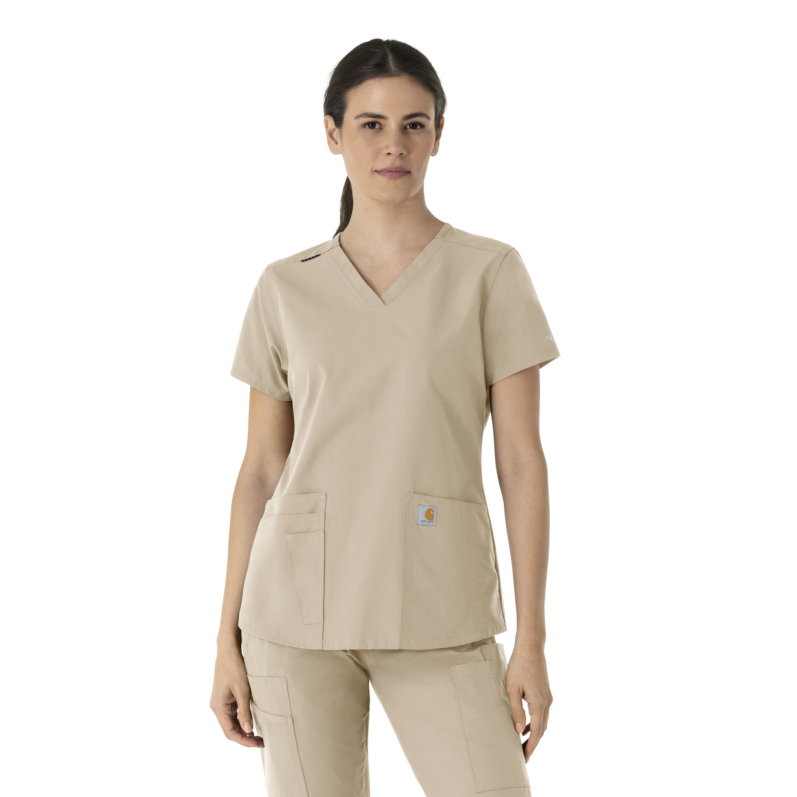Ditch your outdated women’s scrubs and start every shift in comfort in the Carhartt Force Essentials 5-Pocket V-Neck Scrub Top. This stylish women’s scrub top is made with sustainable lightweight fabric and features the long trusted Carhartt Scrubs Rugged Flex Stretch Technology that provides unmatched comfort and durability. Designed for women who want a more tailored fit, this Carhartt top has a classic v-neckline along with back princess seaming and a shirttail hem to complete that tailored, feminine look. Your tools and personal accessories are essential, so we made sure to include functional features like a badge loop at the shoulder and easy to access front pockets with extra details like a hidden cell phone and scissor pocket. Hectic shift? No sweat; this scrub top is built with FastDry Technology that wicks moisture keeping you dry plus Stain Breaker Technology that helps release those inevitable stains before they set in. 50% Recycled Polyester/50% Polyester Womens Pullover Modern V-Neck 3/4" V-Neckline for more feminine look with corded matching badge ID loop at shoulder seam Two large top loading front patch pockets with internal cell phone pocket in wearer's left and an additional internal scissor pocket at the right FastDry® technology keeps you cool for all day comfort, built to move with Rugged Flex® stretch technology, Stain Breaker® technology releases stains Princess seaming at back for a tailored look and feel, curved shirttail hemline Lightweight, durable, sustainable and comfortable Ripstop fabric Carhartt Womens Scrub Top V-Neck Carhartt Core C12113 Machine wash cold with like colors on gentle. Tumble dry on low. Promptly remove from dryer. Cool iron if needed. Avoid using bleach or harsh chemicals.