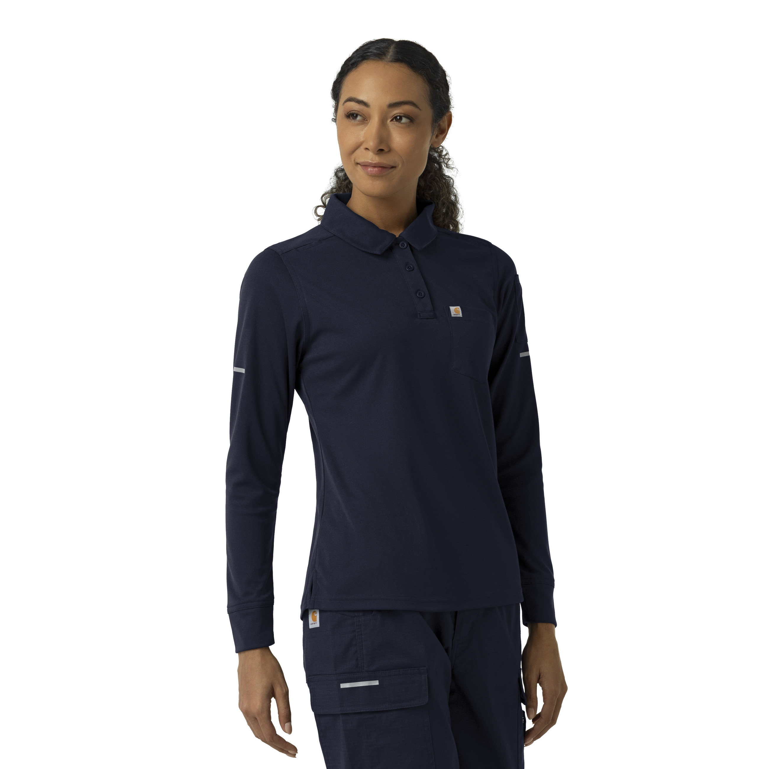 When you're on the front lines of emergency response, you need a uniform that can keep up. This women's long sleeve polo top is built for those critical moments when anything can happen. Crafted from a substantial heavyweight poly pique fabric, it provides reliable durability and a professional appearance that instills confidence. The long sleeves offer added coverage and protection, while the breathable fabric ensures comfort even in high-pressure situations. This polo is equipped to handle the demands of emergency response with a range of specialized features. Multiple pockets provide secure storage for essential tools and equipment, keeping everything you need organized and within reach. Integrated mic clips offer convenient access to communication devices, allowing for clear and efficient communication during critical moments. A utility loop provides a secure attachment point for keys or other small essentials, and a reinforced bartack ensures your pen is always at the ready for documentation. With its combination of durable construction, specialized features, and a professional appearance, this long sleeve polo top is a trusted choice for those who dedicate themselves to emergency response. It's a uniform that reflects the seriousness of your profession while providing the comfort and functionality you need to perform at your best, no matter the challenge. 100% Polyester Womens Pullover Modern Polo Mic clips at each shoulder One chest pocket with pen stall, two sleeve pockets for pens or tools Utility clip at end of 3-button placket Reflective at sleeves and center back Heavyweight poly-span fabric blend Machine wash cold with like colors on gentle. Tumble dry on low. Promptly remove from dryer. Cool iron if needed. Avoid using bleach or harsh chemicals.