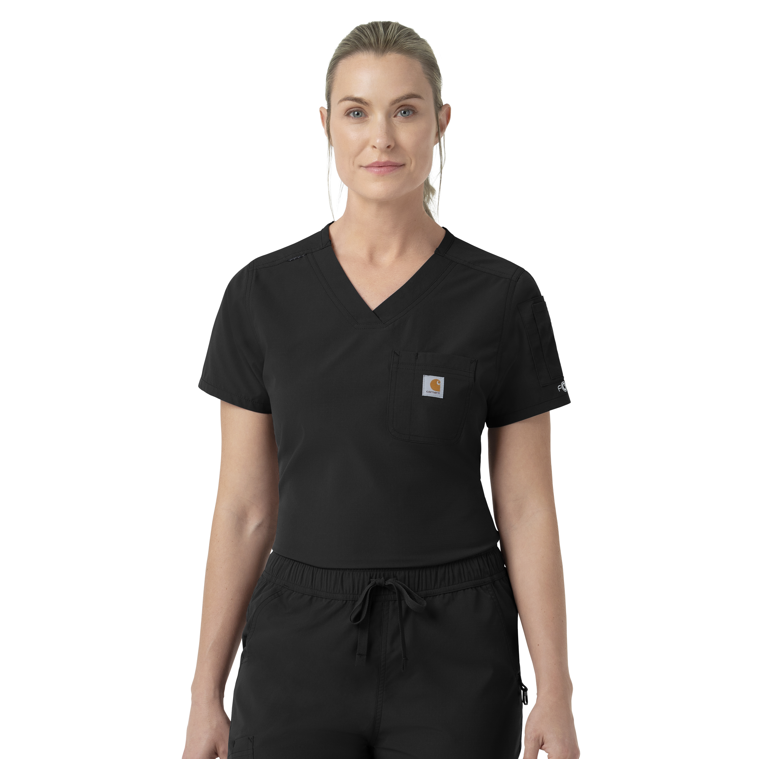 For those who face back-to-back patients, long shifts, and zero time to slow down, this women's Carhartt tuck-in scrub top is designed to keep up with every demand. It's built from strong ripstop fabric that's incredibly durable and designed for relentless work environments. The lightweight material isn't just tough, it's a high-performance fabric that actively wicks away moisture to keep you feeling cool and dry, no matter how fast-paced your day gets. It also expertly repels pet hair, ensuring you maintain a professional and polished appearance whether you work with animals or live with them at home. Plus, with integrated Rugged Flex® stretch technology, the fabric moves with you without restriction, giving you complete freedom for any task at hand. The modern fit is crafted to gently skim the body, providing a silhouette that's neither too tight nor too loose, offering a perfect balance of comfort and a clean, professional look. The longer, tuckable length and a curved hem provide exceptional coverage and effortless ease at the hips, so you can bend, stretch, and move confidently. Design details like the classic V-neck and angled shoulder seams offer a sleek, modern aesthetic that feels as good as it looks. Storage options include a chest pocket with a dedicated pen slot, two more pen pockets, and an additional larger pocket on the sleeve, giving you quick and easy access to all your essential tools. The shoulder badge loop provides a secure spot for your ID badge or other necessary tools. As a core piece from the FLD collection, this scrub top honors those who work in non-traditional healthcare settings, from disaster relief to rural vet care. It has a durable, multi-functional design that's ready for anything. 100% Polyester Ripstop Womens Pullover Modern V-Neck V-Neck with shoulder badge loop One chest pocket with pen slot, sleeve pocket with two pen slots Curved hem Angled shoulder seams Ripstop fabric with moisture wicking, stretch and fur repellency Machine wash cold with like colors on gentle. Tumble dry on low. Promptly remove from dryer. Cool iron if needed. Avoid using bleach or harsh chemicals.