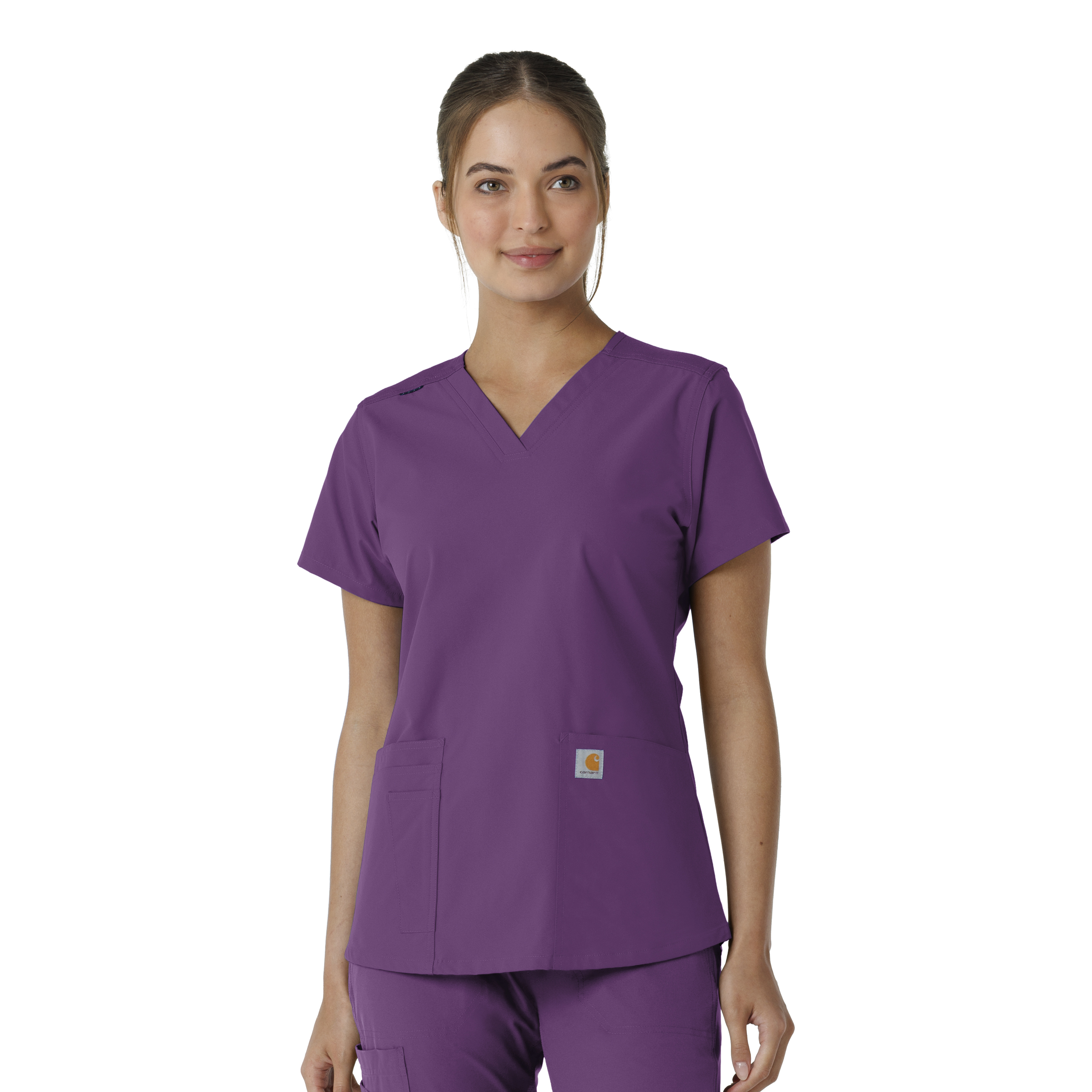 Stay comfortable and move freely with the Carhartt Force Essentials Women's V-neck Scrub Top. Featuring a back yoke knit panel, this top offers flexibility and a tailored fit with a 3/4" V-neckline and curved hem. FastDry® tech wicks away sweat, and Stain Breaker® makes stain removal easy. With two roomy front pockets, an ID badge loop, and dedicated cell phone and scissor pockets, it's built for utility and comfort. 50% Recycled Polyester/50% Polyester Womens Pullover Modern V-Neck 3/4" V-Neckline for more feminine look with corded matching badge ID loop at shoulder seam Two large top loading front patch pockets with internal cell phone pocket in wearer's left and an additional internal scissor pocket at the right FastDry® technology keeps you cool for all day comfort, built to move with Rugged Flex® stretch technology, Stain Breaker® technology releases stains Curved shirttail hemline, shoulder knit panels for more flexibility Lightweight, durable, sustainable and comfortable fabric Machine wash cold with like colors on gentle. Tumble dry on low. Promptly remove from dryer. Cool iron if needed. Avoid using bleach or harsh chemicals.