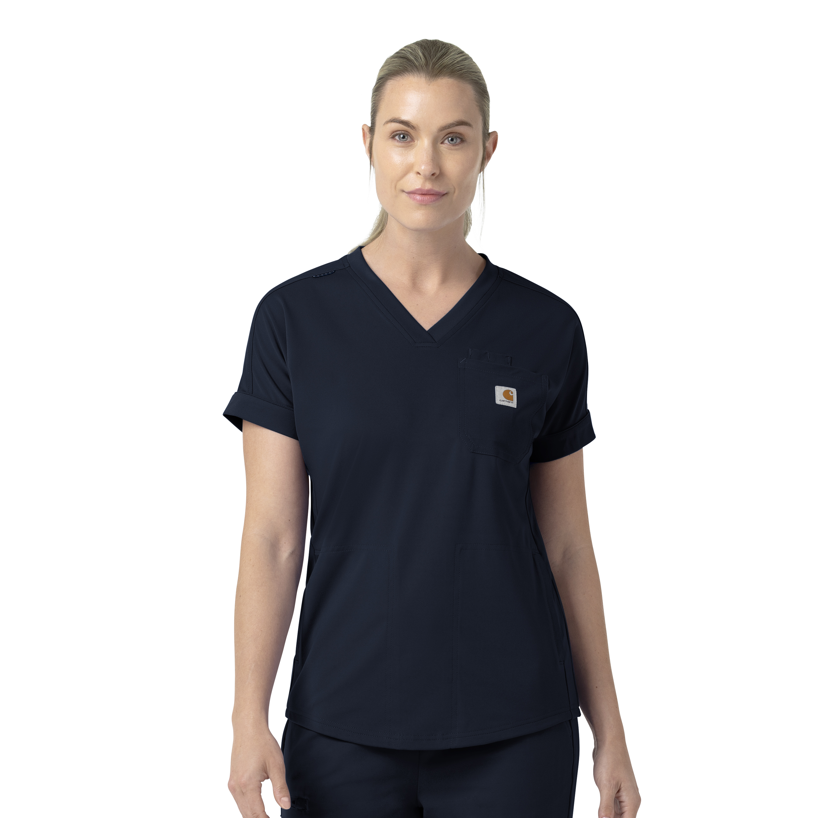 Built strong, worn easy. This women's Carhartt V-neck scrub top is designed to combine work-ready toughness with a comfortable feel that's soft, breathable, and easy to move in, so you stay focused all shift long. It's crafted from four-way stretch knit, a high-performance fabric that actively wicks away moisture and dries fast, keeping you comfortable and dry on even the most hectic days. You'll appreciate its durability too. As a core piece from the Force Cross-Flex collection, this top is built to last and made to move with Rugged Flex™ technology. It features reinforced stitching at high-wear points, ensuring it can handle the daily demands of your job and giving you more mileage out of your scrubs. This is the kind of gear you'll want to wear on repeat, so we built it for the long haul. The modern fit is crafted to gently skim the body, providing a professional silhouette that's neither too tight nor too loose, offering a perfect balance of comfort and style. Design details like the classic V-neck and stylish banded cuffs offer a sleek, updated look, while the curved hem provides a clean, modern finish. Ample pockets give you plenty of storage options. This top features heavy-hauling pockets that are reinforced for added durability, including two side-entry hand pockets and a dedicated chest pocket with a pen slot, giving you quick access to all your essential tools. The shoulder badge loop provides a secure spot for your ID badge or other necessary tools, keeping them close at hand. 78% Polyester/22% Spandex Womens Pullover Modern V-Neck V-Neck with shoulder badge loop One chest pocket with pen slot, two side entry pockets Curved hem Durable Construction Soft and stretchy knit fabric with moisture wicking Machine wash cold with like colors on gentle. Tumble dry on low. Promptly remove from dryer. Cool iron if needed. Avoid using bleach or harsh chemicals.