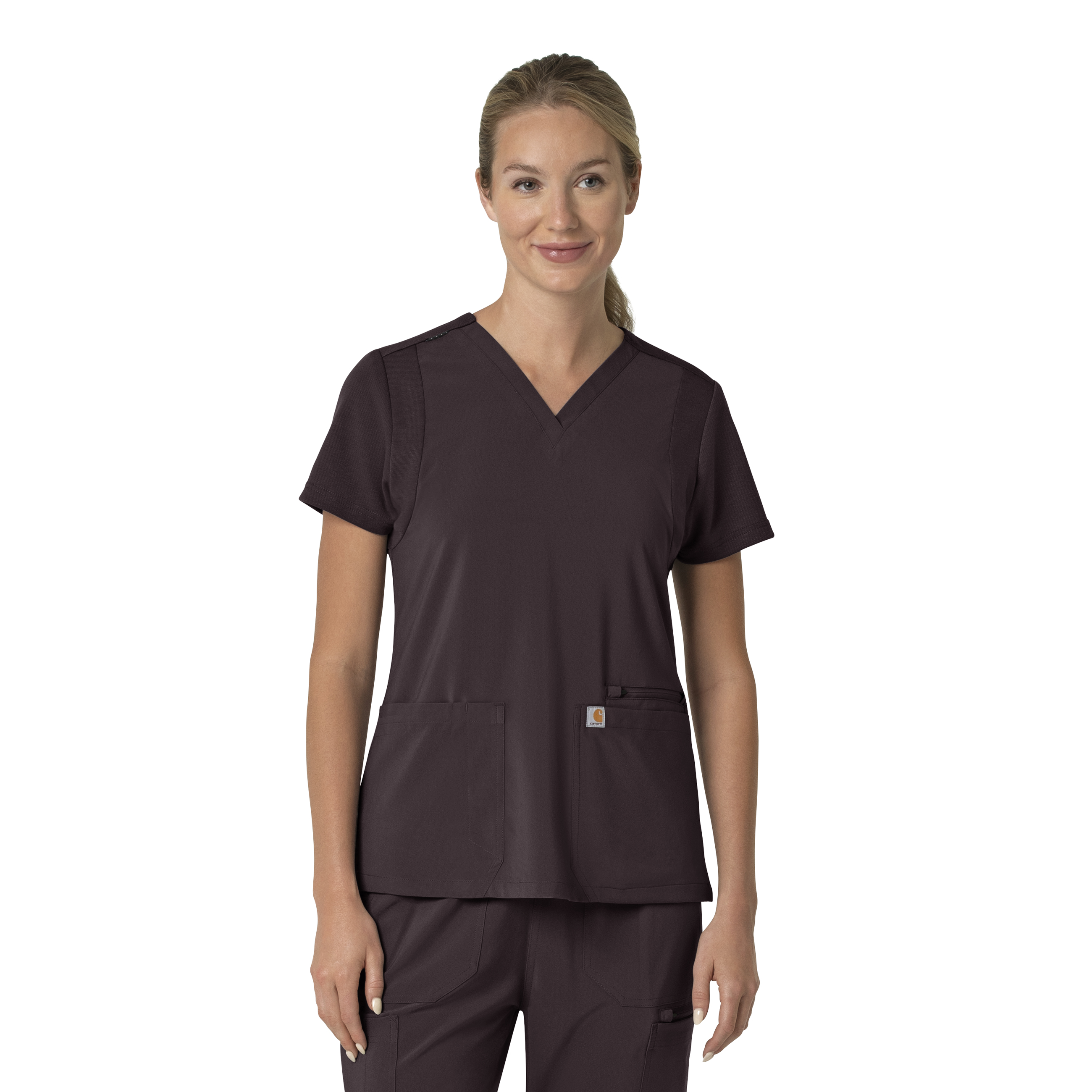 Not only do these scrubs keep you comfortable, but they also enhance your productivity. Part of the Force Cross-Flex collection, they wick away sweat and dry quickly, ensuring you stay fresh and focused during every shift. With a V-neck design and convenient features like a shoulder badge loop, two spacious front patch pockets, a pen slot, and a zipped cell pocket, these scrubs are designed to make your life easier. Plus, side vents around the hips offer even more mobility. Choose the Carhartt Women's Flex Panel V-Neck Scrub Top and experience comfort, durability, and performance in one stylish package. 94% Polyester/6% Spandex Womens Pullover Modern V-Neck V-Neck with shoulder badge loop Two large front patch pockets with pen slot on the right and a smaller zipped cell pocket on the left Rib knit fabric at shoulders and sleeves as well as the racerback detail all allow for ease of movement Side vents for ease of movement around the hips Durable and comfortable polyester spandex blend of fabric Machine wash cold with like colors on gentle. Tumble dry on low. Promptly remove from dryer. Cool iron if needed. Avoid using bleach or harsh chemicals.