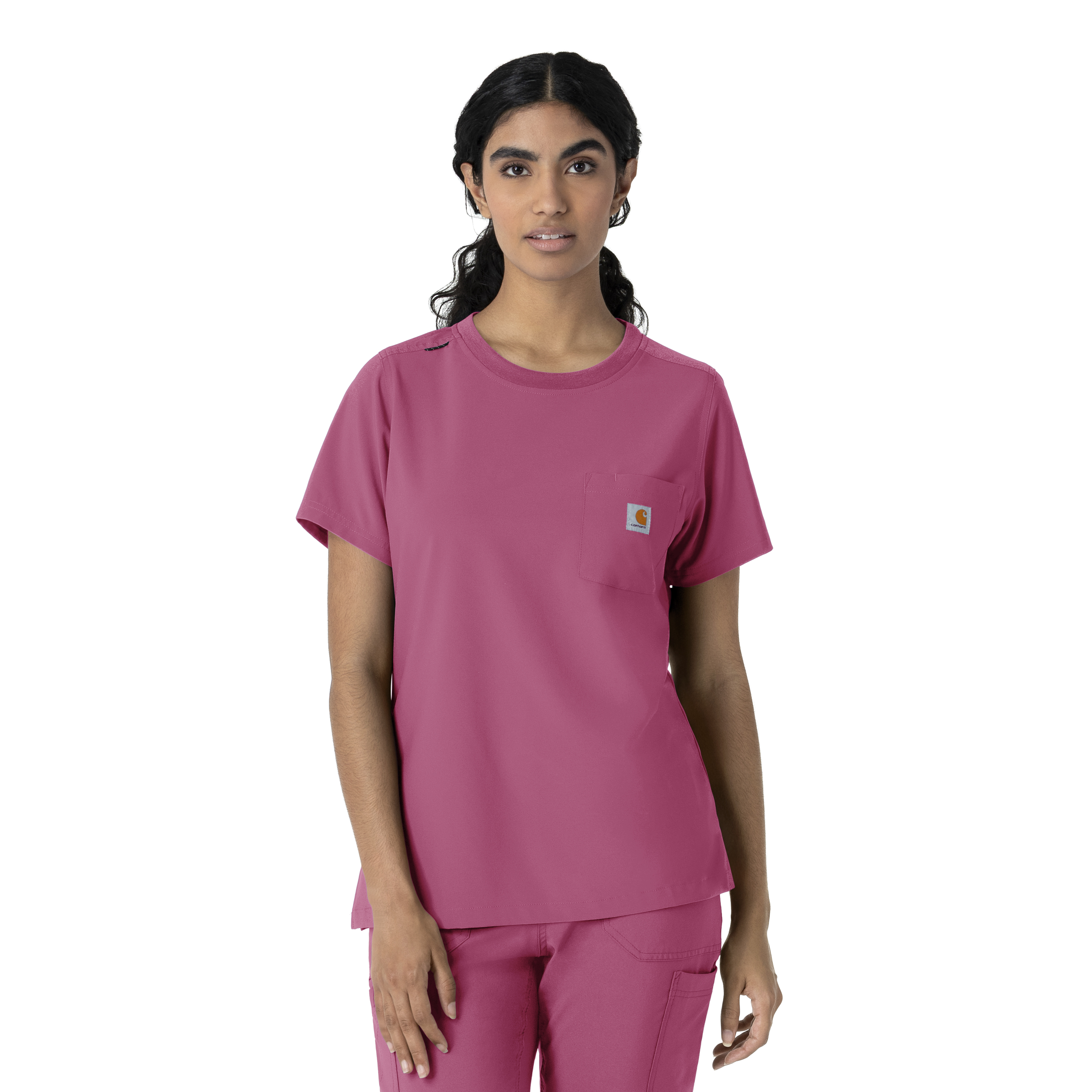 This women's Carhartt scrub top is the perfect blend of everyday comfort and rugged durability, designed to tackle the challenges of long, demanding shifts. It's crafted from a durable stretch polyester fabric that moves with you, providing the flexibility needed for dynamic work environments. The material is built to withstand the wear and tear of a busy workday, ensuring longevity and consistent performance. While it maintains the casual appearance of a classic t-shirt, this scrub top is packed with functional features. A secure zip pocket adds an extra layer of security for valuables. The integrated shoulder badge loop ensures your ID is always visible and readily accessible, streamlining identification procedures. This top is designed to keep you comfortable and organized throughout your shift. 94% Polyester/6% Spandex Womens Pullover Modern Crew Neck Knit fabric crew neck with shoulder badge loop One top loading chest pocket with pen slot Side hem vents for ease of movement at hips Forward shoulder seams Durable and comfortable polyester spandex blend of fabric Machine wash cold with like colors on gentle. Tumble dry on low. Promptly remove from dryer. Cool iron if needed. Avoid using bleach or harsh chemicals.