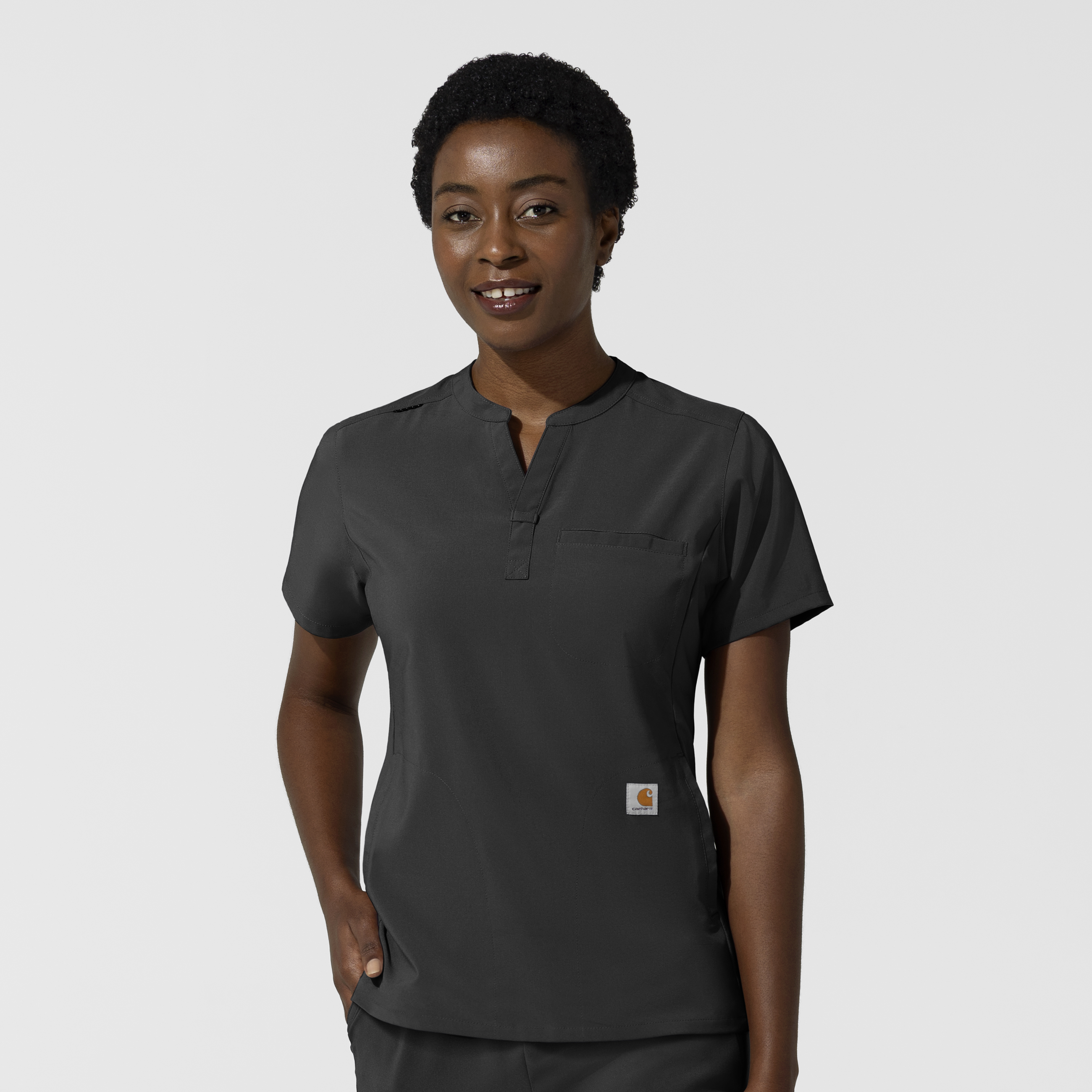 94% Polyester/6% Spandex Womens Pullover Modern Banded Collar Banded collar with extended overlapping placket and self-fabric utility loop Convenient badge loop positioned at the shoulder Three functional pockets: one welt chest pocket and two curved side-entry hand pockets Center back pleat designed for ease of movement Curved, slightly longer back hem for added coverage Machine wash cold with like colors on gentle. Tumble dry on low. Promptly remove from dryer. Cool iron if needed. Avoid using bleach or harsh chemicals.