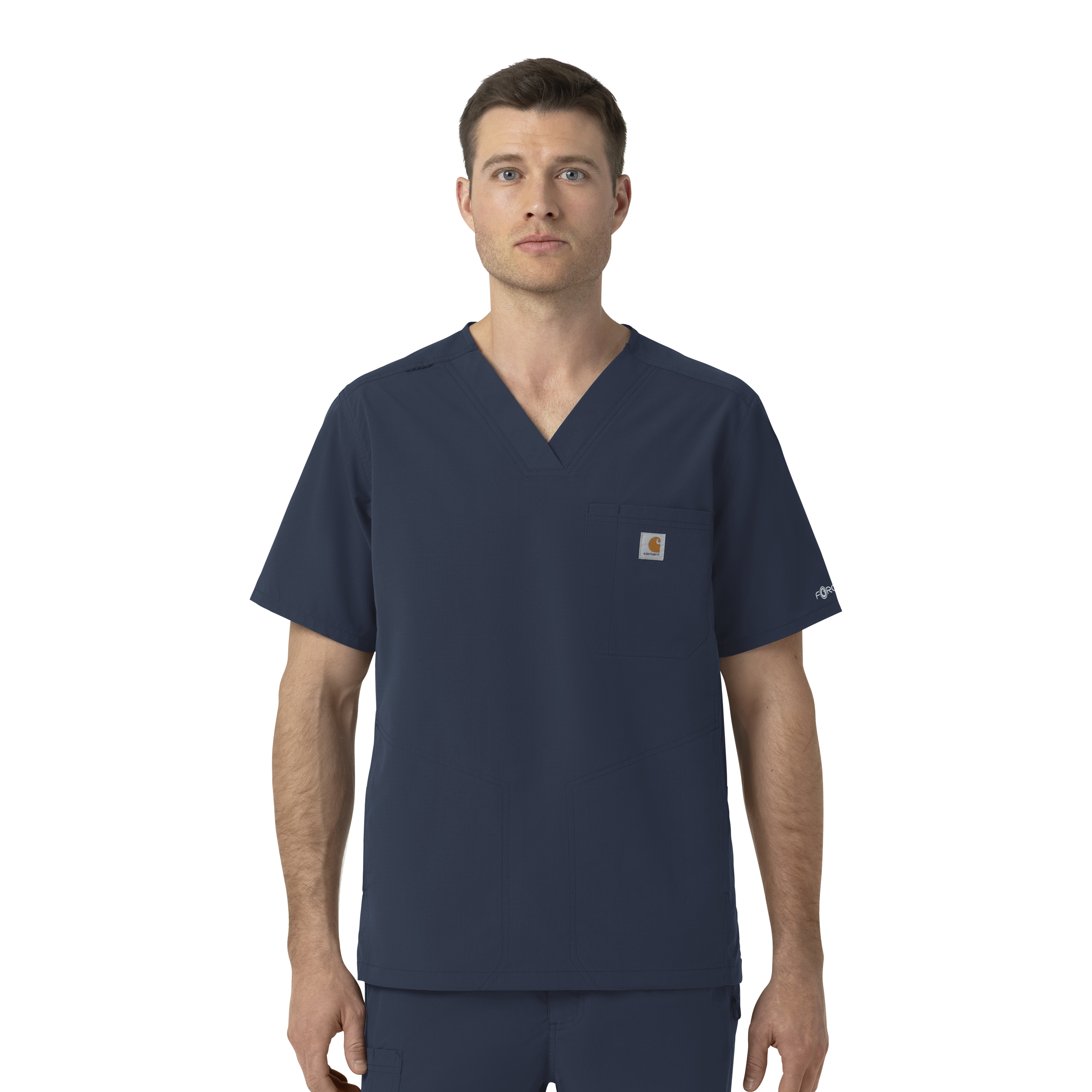 For those who face back-to-back patients, long shifts, and zero time to slow down, this men's Carhartt scrub top is designed to keep up with every demand. It's built from strong ripstop fabric that's incredibly durable and designed for relentless work environments. The lightweight material isn't just tough, it's a high-performance fabric that actively wicks away moisture to keep you feeling cool and dry, no matter how fast-paced your day gets. It also expertly repels pet hair, ensuring you maintain a professional and polished appearance whether you work with animals or live with them at home. Plus, with integrated Rugged Flex® stretch technology, the fabric moves with you without restriction, giving you complete freedom for any task at hand. The modern fit is crafted to gently skim the body, providing a silhouette that's neither too tight nor too loose, offering a perfect balance of comfort and a clean, professional look. Design details like the classic V-neck and angled shoulder seams offer a sleek, modern aesthetic. The addition of side hem vents provides extra mobility and ease of movement, so you can bend, stretch, and move confidently. Nurses can never have too many pockets, and this top delivers. It's equipped with plenty of purposeful storage, including two side-entry hand pockets, one chest pocket, and one pen pocket, giving you quick and easy access to all your essential tools. The shoulder badge loop provides a secure spot for your ID badge or other necessary tools. As a core piece from the FLD collection, this scrub top honors those who work in non-traditional healthcare settings, from disaster relief to rural vet care. It has a durable, multi-functional design that's ready for anything. 100% Polyester Ripstop Mens Pullover Modern V-Neck V-Neck style One chest pocket, one pen pocket, two side entry pockets Side vents at hem for ease of movement Shoulder badge loop at wearer's right side Ripstop fabric with moisture wicking, stretch and fur repellency Machine wash cold with like colors on gentle. Tumble dry on low. Promptly remove from dryer. Cool iron if needed. Avoid using bleach or harsh chemicals.