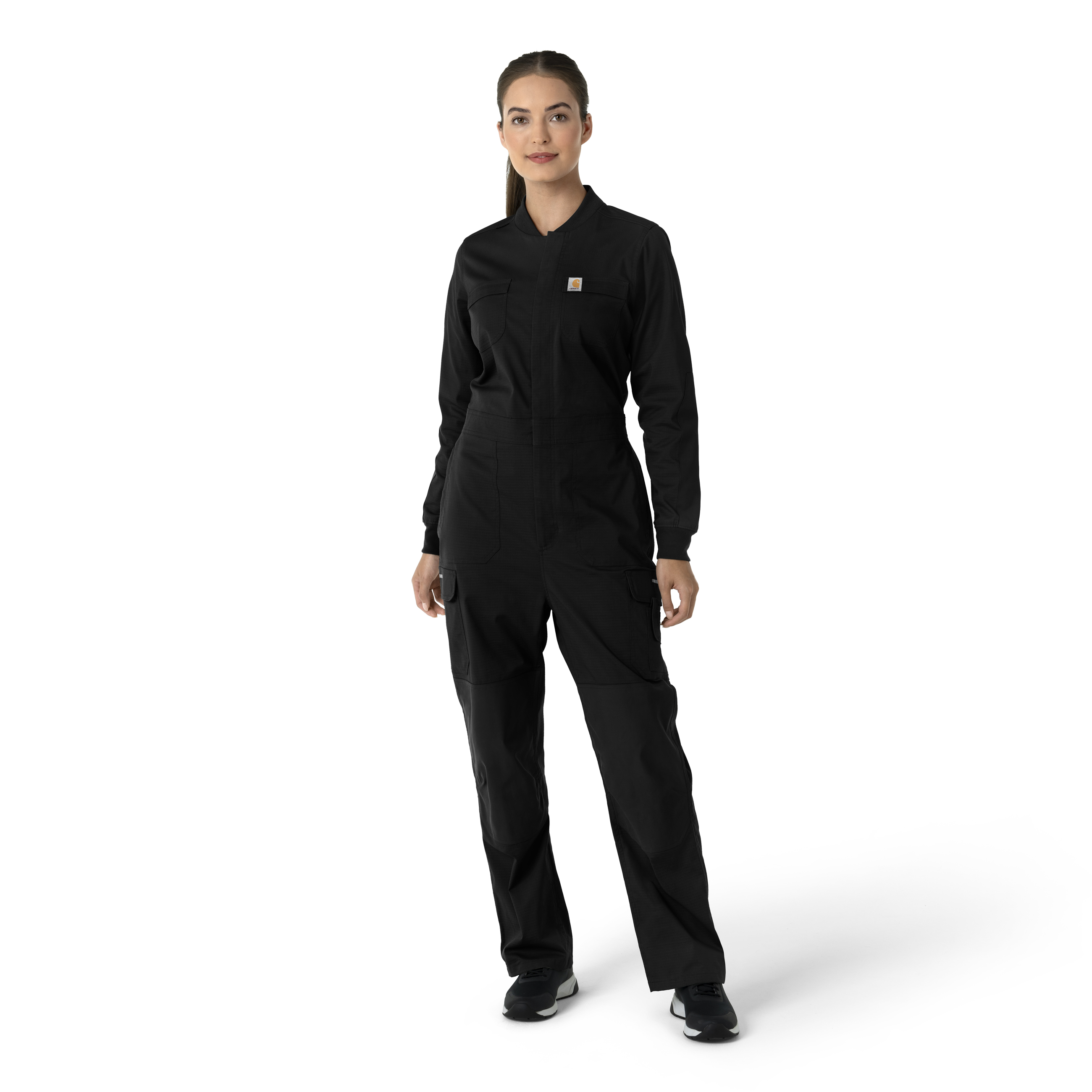 When your work takes you outdoors and into demanding environments, these women's coveralls provide the reliable protection you need to get the job done. Built to withstand the elements and the rigors of physical work, they're crafted from tough yet stretchy Rugged Flex™ ripstop fabric with a Durable Water Repellent (DWR) coating. This combination ensures exceptional durability, flexibility, and protection against moisture, keeping you dry and comfortable in a variety of conditions. Functionality is paramount, and these coveralls are outfitted with a total of 11 pockets, strategically placed to provide ample storage for tools, equipment, and personal items. Whether you need to carry small essentials or larger tools, these pockets ensure everything you need is organized and within reach. Reinforced elbow and knee panels provide added durability and protection in high-wear areas, increasing the lifespan of the garment and enhancing your comfort during demanding tasks. With their combination of durable construction, thoughtful design, and practical features, they're a valuable asset for any professional who faces the elements head-on. 55% Cotton/42% Polyester/3% Spandex Rugged Flex Ripstop Womens Zipper Modern Coverall Front zipper opening with secure snap at neck and shoulder badge loop Two chest pockets, two front zip hand pockets, three smaller pockets with tabs, two cargo pockets, two back pockets Elastic at back waist for a better fit Soft knit fabric at collar and cuffs Stretchy and durable water repellent fabric Machine wash cold with like colors on gentle. Tumble dry on low. Promptly remove from dryer. Cool iron if needed. Avoid using bleach or harsh chemicals.