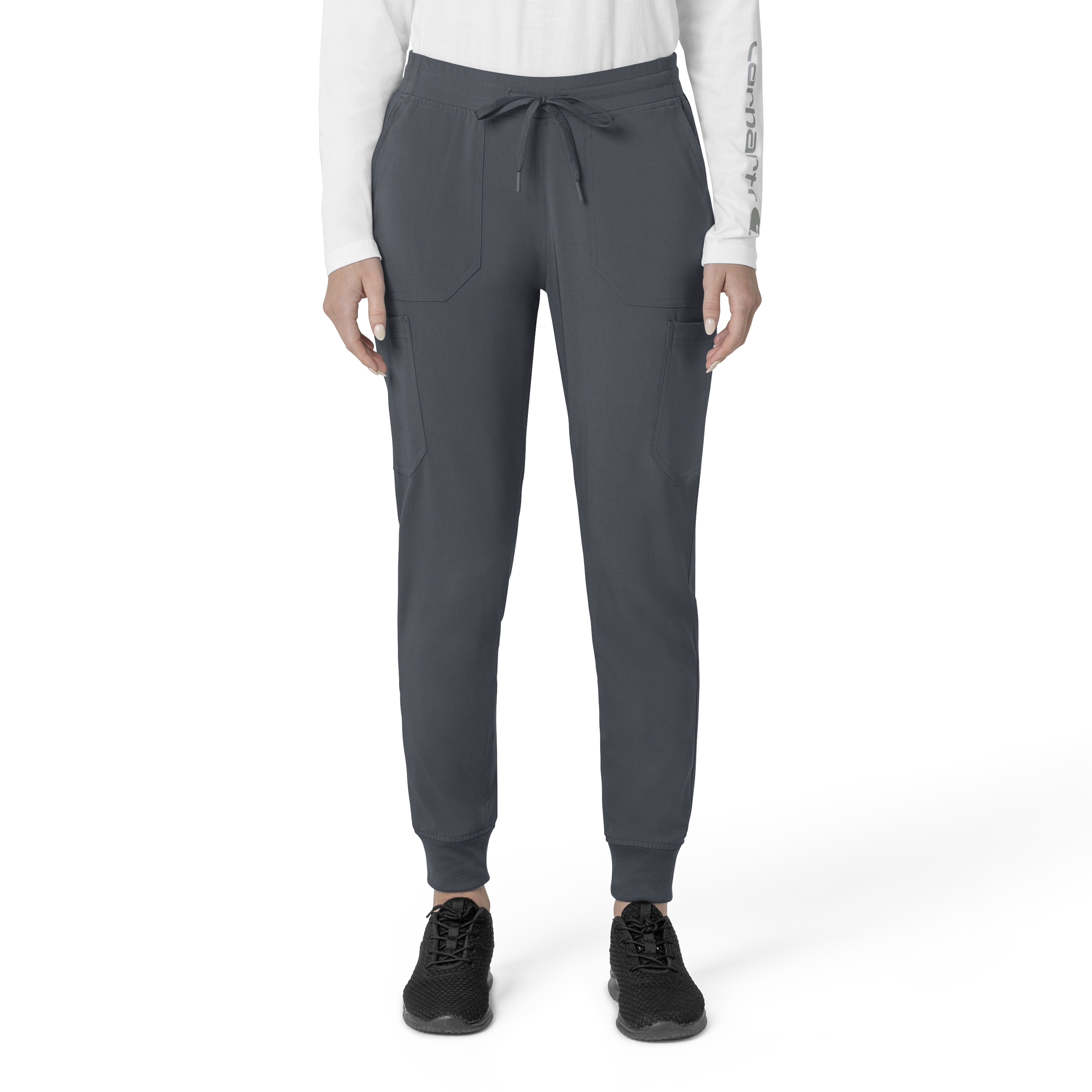 Stay organized with multiple pockets, including deep front slash pockets, cargo pockets with pen and cell phone slots, Carhartt-style back pockets, and a secure zip pocket with a mesh pocket bag. Your essentials are always within reach. With FastDry® technology to keep you cool and dry and Rugged Flex™ stretch technology for unrestricted movement, these scrubs from the Force Cross-Flex collection are designed to help you excel on every shift. Trust Carhartt for the durability and comfort you need in your medical uniform. 94% Polyester/6% Spandex Womens Drawstring Mid Rise Modern Jogger Rib knit comfort waistband with elastic and full drawstring Two deep front slash pockets with inset connections, cargo pocket at wearer’s right with pen slot, cargo pocket at wearer’s left with mesh cell pocket, two back Carhartt style pockets, secure zip pocket at wearer’s back right with mesh pocket bag Jogger leg fit with rib knit at bottom cuff Double needle topstitching throughout for additional durability Durable and comfortable polyester spandex blend of fabric Machine wash cold with like colors on gentle. Tumble dry on low. Promptly remove from dryer. Cool iron if needed. Avoid using bleach or harsh chemicals.