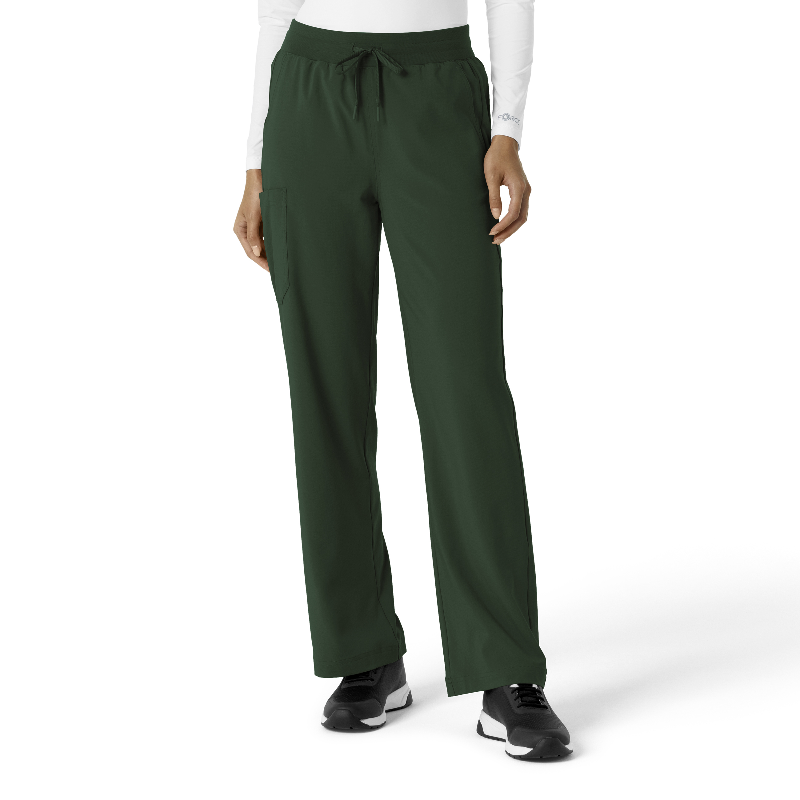 Tackle every shift with confidence in the Carhartt Force Cross-Flex Women's Boot Cut Scrub Pant. Designed for durability, these pants feature soft, stretchy fabric that moves with you, whether you're making rounds or handling urgent situations. Multiple secure pockets keep your essentials handy, while inset designs prevent anything from slipping out during your busy day. These scrub pants are built to perform, just like you. 94% Polyester/6% Spandex Womens Elastic Mid Rise Modern Bootcut Full elastic knit waistband Two front slash pockets, cargo pocket at wearer's right with pen slot and internal utility loops, two back Carhartt style pockets Drawstring that can be worn inside or out Pocket insets ensure valuables don't fall out Double needle stitching throughout Machine wash cold with like colors on gentle. Tumble dry on low. Promptly remove from dryer. Cool iron if needed. Avoid using bleach or harsh chemicals.
