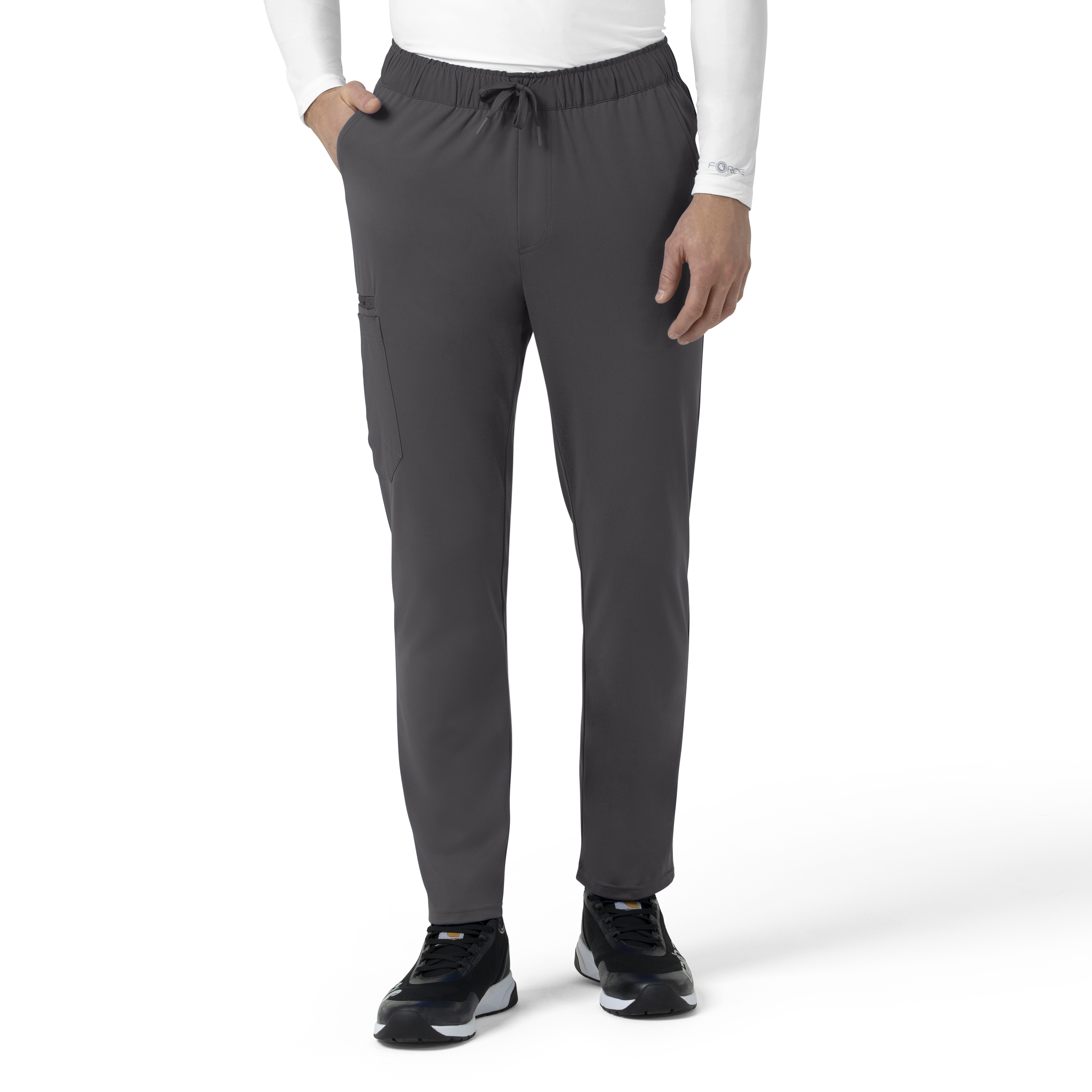 Tough enough for the job, comfortable enough for a quick nap in the breakroom. These men's Carhartt bootcut scrub pants have it all. Built to move, they're crafted from soft yet durable four-way stretch knit with Rugged Flex™ stretch technology that gives you full freedom when bending, squatting, or rushing between patients. Ready to work as hard as you do, these pants also wick moisture and dry fast, so you stay cool and focused when the pressure is on. And because you'll be wearing these on repeat, we made sure they're built to last. As a core piece from the Force Cross-Flex collection, these scrubs are built for the long haul, with reinforced stitching at high-wear points like the pockets and waistband to give you more mileage wear after wear. The modern straight-leg cut drapes clean and straight from waist to hem for a comfortable and professional silhouette that's both functional and stylish. The elastic waist with a drawstring ensures a secure, personalized fit that keeps you comfortable all shift long. As for storage options, the pants come with heavy-hauling pockets that are reinforced for added durability, so you'll have space for tools and essentials. They feature two side-entry hand pockets, one back pockets, a spacious cargo pocket, a secure zip pocket, and a pen pocket, giving you plenty of space to organize and carry everything you need. Reach for these durable scrub pants to stay comfortable, confident, and prepared for whatever the day throws at you. 78% Polyester/22% Spandex Mens Elastic Mid Rise Modern Tapered Leg Full elastic waistband Two side entry pockets with inset connection, one cargo pocket, one pen pocket, one secure zip pocket, one back pocket Drawcord for adjustability Moisture wicking and quick dry Soft and stretchy knit fabric Machine wash cold with like colors on gentle. Tumble dry on low. Promptly remove from dryer. Cool iron if needed. Avoid using bleach or harsh chemicals.