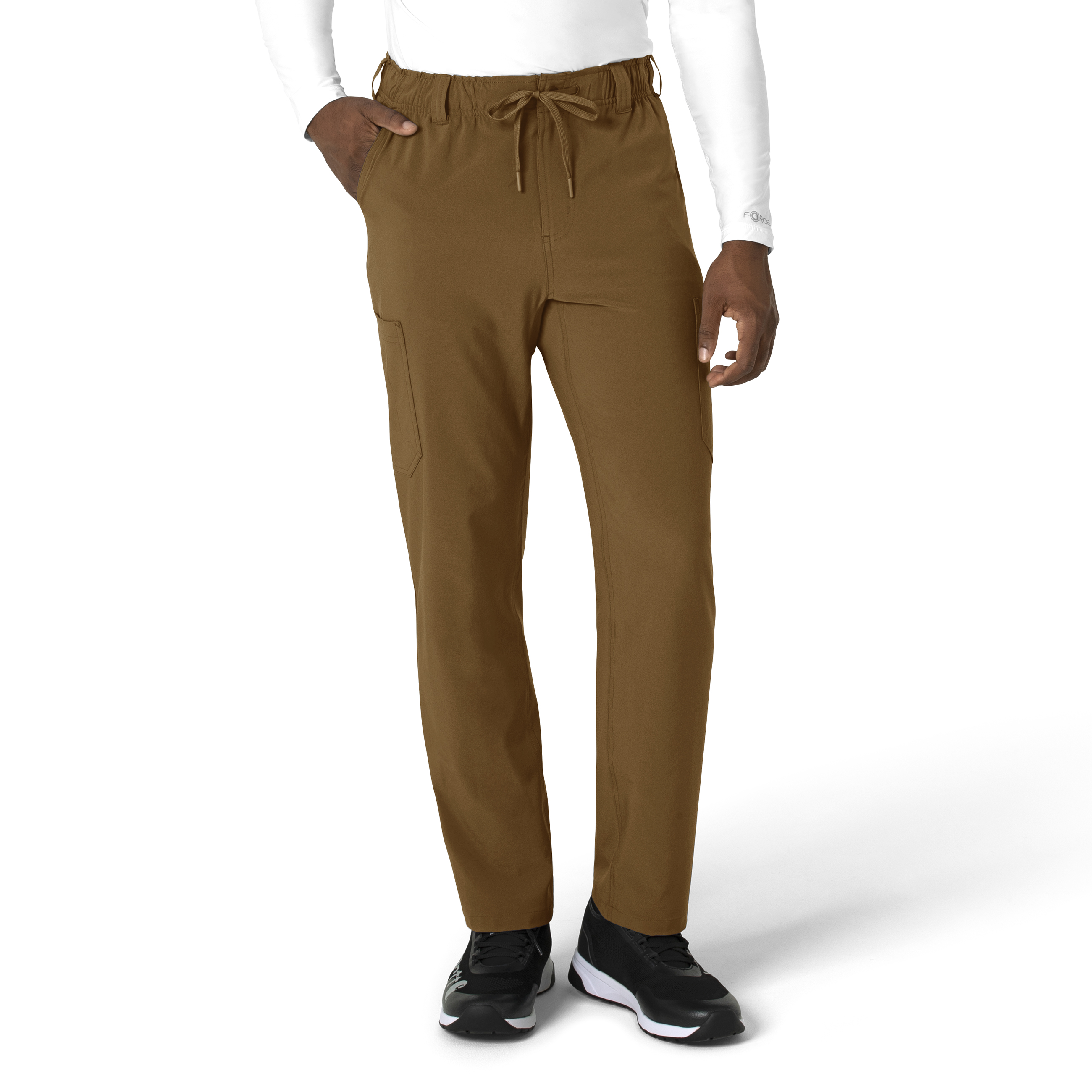 Show up to each shift in a fresh and modern look that delivers on utility with practical design. These men's scrub pants have a straight-leg fit that keeps things simple and streamlined. They're made with a soft and stretchy material that has micro ripstop built into it, making the most of durability for long-lasting wear. No worries when it comes to the essentials you need to keep your shift moving smoothly — these scrub pants are designed with pockets that hold it all. Two deep front pockets and two back pockets make it easy to access items and tools, while one hidden zip pocket at the right keeps small valuables out of sight. On the right is a cargo pocket with a pen slot plus utility loops that give you a convenient spot to secure things like your glasses or badge. On the left is another cargo pocket built with an interior mesh pocket for your phone. These scrub pants are part of our Force Cross-Flex collection that wicks sweat and dries fast, making them perfect for any shift. 94% Polyester/6% Spandex Mens Pull On Mid Rise Modern Straight Leg Full elastic waistband with drawstring One hidden zip pocket at right side seam, two deep front slash pockets, right side cargo pocket with pen slot and utility loops, left side cargo pocket with internal mesh cellphone pocket, two back pockets Full functioning snap and fly Crotch gusset for ease of movement Stretchy, durable, and comfortable with micro ripstop Machine wash cold with like colors on gentle. Tumble dry on low. Promptly remove from dryer. Cool iron if needed. Avoid using bleach or harsh chemicals.