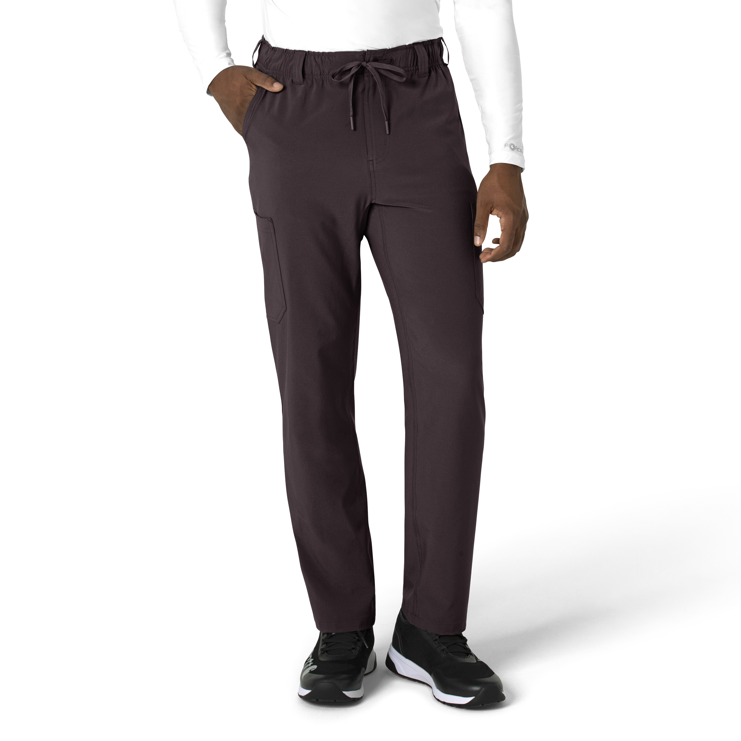 Show up to each shift in a fresh and modern look that delivers on utility with practical design. These men's scrub pants have a straight-leg fit that keeps things simple and streamlined. They're made with a soft and stretchy material that has micro ripstop built into it, making the most of durability for long-lasting wear. No worries when it comes to the essentials you need to keep your shift moving smoothly — these scrub pants are designed with pockets that hold it all. Two deep front pockets and two back pockets make it easy to access items and tools, while one hidden zip pocket at the right keeps small valuables out of sight. On the right is a cargo pocket with a pen slot plus utility loops that give you a convenient spot to secure things like your glasses or badge. On the left is another cargo pocket built with an interior mesh pocket for your phone. These scrub pants are part of our Force Cross-Flex collection that wicks sweat and dries fast, making them perfect for any shift. 94% Polyester/6% Spandex Mens Pull On Mid Rise Modern Straight Leg Full elastic waistband with drawstring One hidden zip pocket at right side seam, two deep front slash pockets, right side cargo pocket with pen slot and utility loops, left side cargo pocket with internal mesh cellphone pocket, two back pockets Full functioning snap and fly Crotch gusset for ease of movement Stretchy, durable, and comfortable with micro ripstop Machine wash cold with like colors on gentle. Tumble dry on low. Promptly remove from dryer. Cool iron if needed. Avoid using bleach or harsh chemicals.