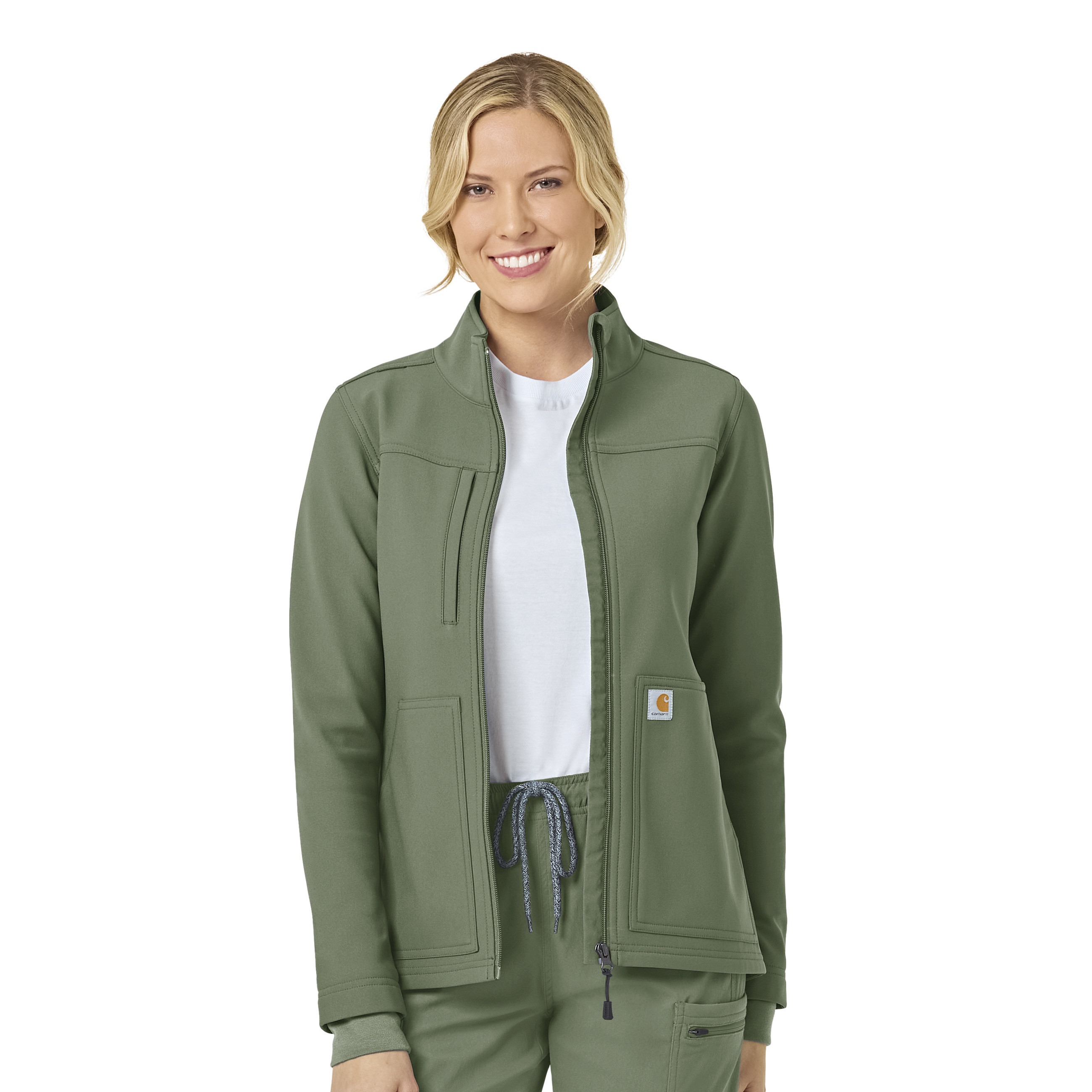 The Women’s Carhartt Medical Rugged Flex Peak Modern Fit Bonded Fleece Jacket is an ideally affordable women's jacket from a brand you can trust for all of the best technology, durable and dependable products, and a fit and comfort like no other. The two large front patch side-entry pockets, the front patch pocket on the wearers left proudly features the classic Carhartt logo, plus there is an exterior welt zip pocket on the wearers left chest for storing smaller items securely. The jacket is a full front zip with a Carhartt logo zipper pull with a chin guard at the top of the zipper for comfort. It also features ribbed sleeve cuffs so you could pull you sleeves up if needed and they would stay put. The bungee ID loop is placed smartly along the shoulder seam so that you can use it if needed, but it goes virtually unnoticed if not in use. This women's jacket has earned the Rugged Flex stamp of approval with the perfect amount of stretch, and is treated with the popular and reliable HEIQ ECO DRY technology for an eco-friendly and durable water repellency that encourages the fluid to bead up and roll off before it gets the chance to soak in. The bonded fleece is comfortable and rugged while also being fashionable. 100% Polyester Bonded Fleece Womens Zipper Modern Fleece Jacket Full zip front with chin guard at top, bungee ID loop at shoulder Large front patch side-entry pockets, zip welt exterior chest pocket HeiQ ECO DRY technology for eco-friendly durable water repellency Ribbed sleeve cuffs, embroidery friendly 100% Polyester bonded fleece Carhartt Womens Jackets/Vests Fleece Jacket Peak C81023 Machine wash cold with like colors on gentle. Tumble dry on low. Promptly remove from dryer. Cool iron if needed. Avoid using bleach or harsh chemicals.