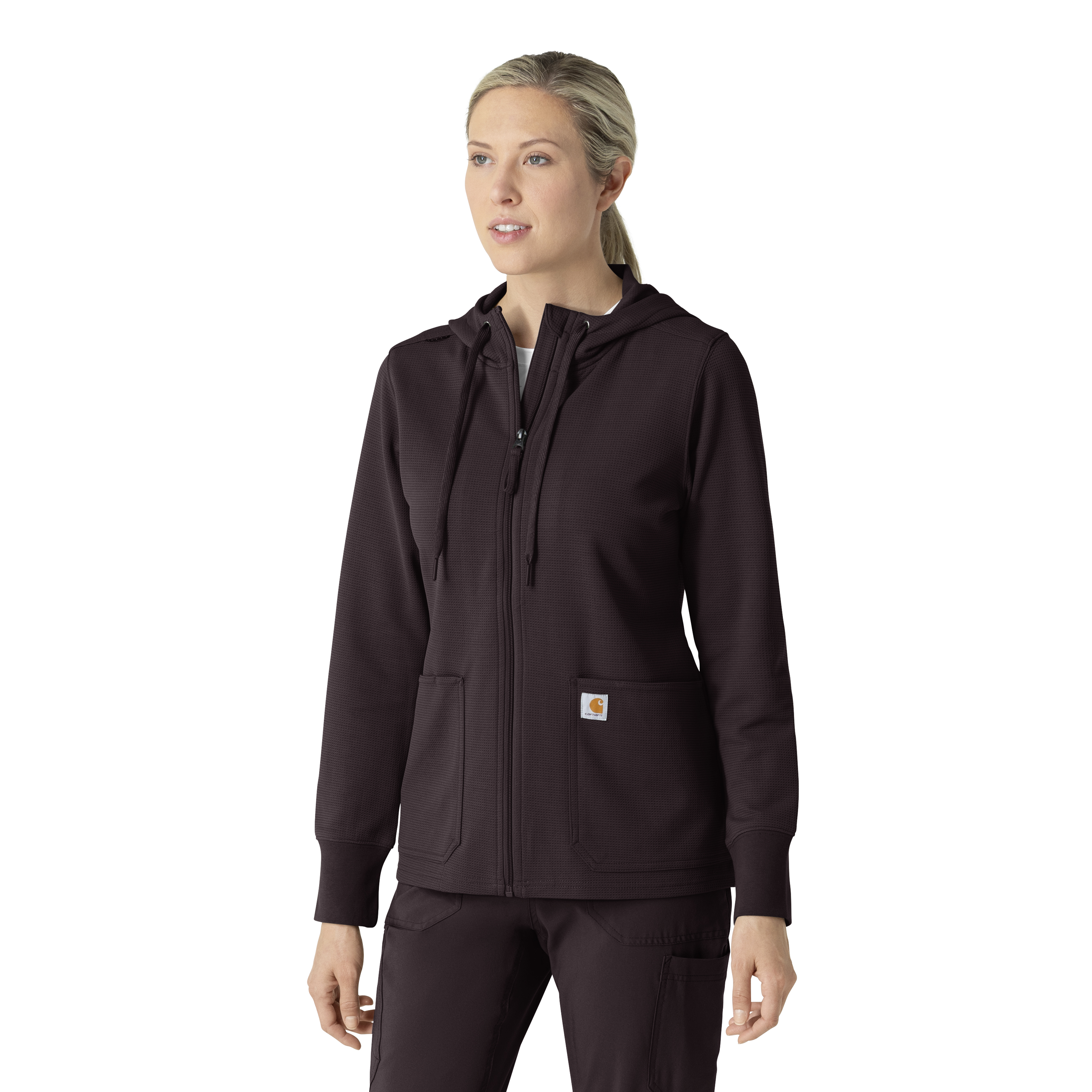 This women's Carhartt hoodie seamlessly blends the brand's signature casual style with the practical performance features essential for busy professionals. Crafted from a comfortable waffle-knit polyester fabric, it offers a soft yet durable layer for everyday wear. The full-zip design allows for easy on and off, providing versatile temperature control. Functionality is prioritized with an abundance of pockets, ensuring you have ample space for all your necessities. Notably, an internal stethoscope pocket keeps this crucial tool secure and readily accessible. The extra-long knit cuffs are designed to be compatible with gloves, providing a seamless and comfortable fit that eliminates gaps and enhances protection. A badge loop at the shoulder ensures your ID is clearly displayed, streamlining identification processes and enhancing workplace efficiency. This hoodie is more than just a casual garment; it's a carefully designed piece of performance wear built to meet the demands of your busy schedule while maintaining a comfortable and stylish appearance. It's the perfect combination of Carhartt's rugged durability and thoughtful design, making it an ideal choice for any healthcare professional seeking a reliable and functional hoodie. 100% Polyester Womens Zipper Modern Hoodie Chin guard, full zipper and shoulder badge loop Two top loading pockets with one pen slot, one internal stethoscope pocket Three piece hood with drawcord Long knit cuffs that stay put, making it easy to slide gloves over Soft waffle-knit polyester fabric Machine wash cold with like colors on gentle. Tumble dry on low. Promptly remove from dryer. Cool iron if needed. Avoid using bleach or harsh chemicals.