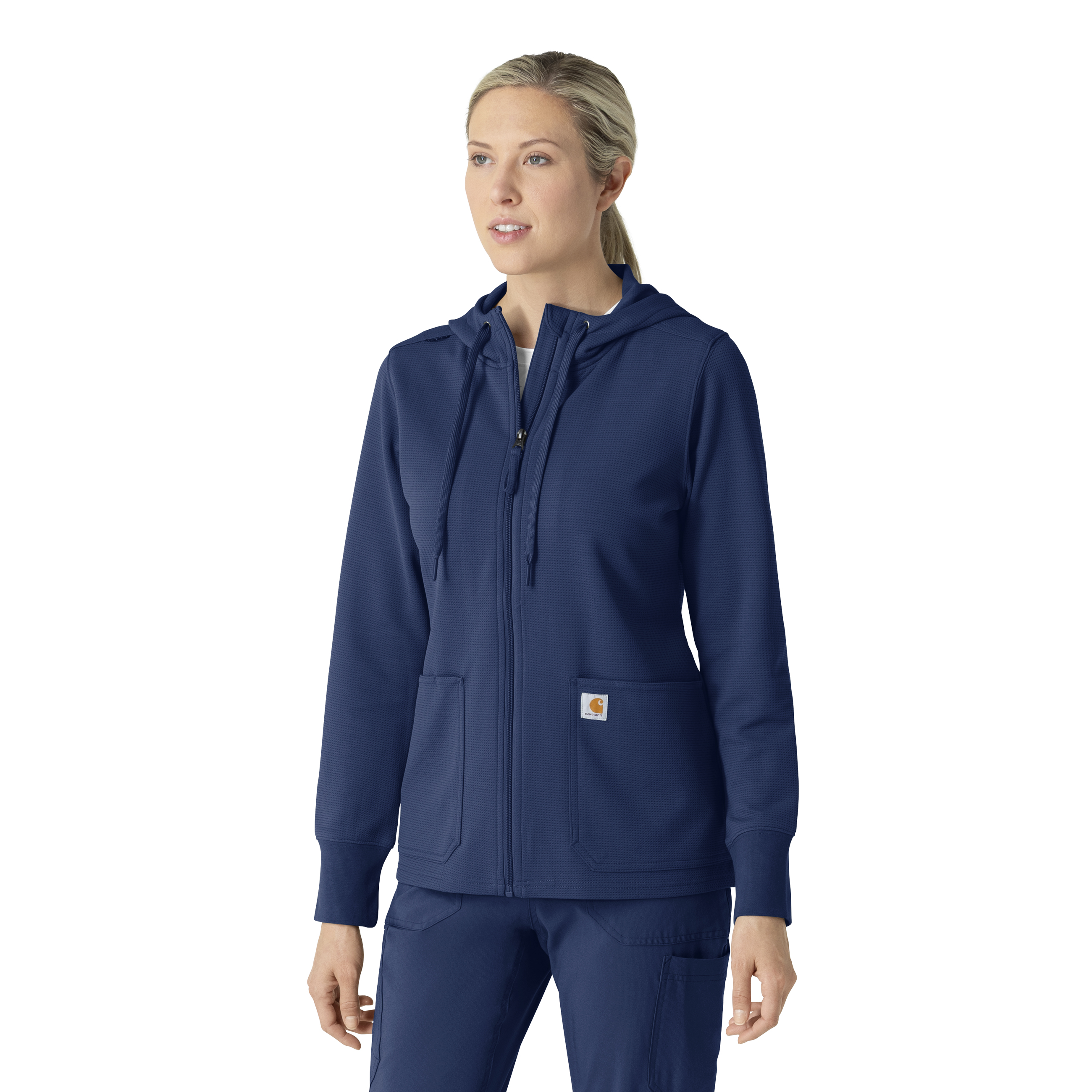 This women's Carhartt hoodie seamlessly blends the brand's signature casual style with the practical performance features essential for busy professionals. Crafted from a comfortable waffle-knit polyester fabric, it offers a soft yet durable layer for everyday wear. The full-zip design allows for easy on and off, providing versatile temperature control. Functionality is prioritized with an abundance of pockets, ensuring you have ample space for all your necessities. Notably, an internal stethoscope pocket keeps this crucial tool secure and readily accessible. The extra-long knit cuffs are designed to be compatible with gloves, providing a seamless and comfortable fit that eliminates gaps and enhances protection. A badge loop at the shoulder ensures your ID is clearly displayed, streamlining identification processes and enhancing workplace efficiency. This hoodie is more than just a casual garment; it's a carefully designed piece of performance wear built to meet the demands of your busy schedule while maintaining a comfortable and stylish appearance. It's the perfect combination of Carhartt's rugged durability and thoughtful design, making it an ideal choice for any healthcare professional seeking a reliable and functional hoodie. 100% Polyester Womens Zipper Modern Hoodie Chin guard, full zipper and shoulder badge loop Two top loading pockets with one pen slot, one internal stethoscope pocket Three piece hood with drawcord Long knit cuffs that stay put, making it easy to slide gloves over Soft waffle-knit polyester fabric Machine wash cold with like colors on gentle. Tumble dry on low. Promptly remove from dryer. Cool iron if needed. Avoid using bleach or harsh chemicals.
